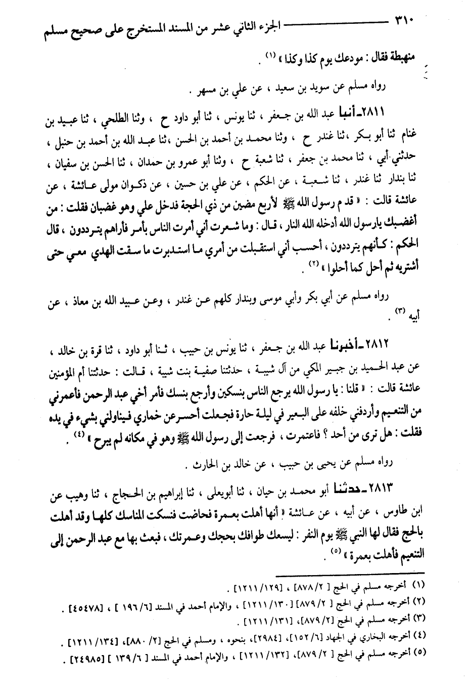 2811 - أَنْبَأَ عَبْدُ اللَّهِ بْنُ جَعْفَرٍ ثَنَا يُونسُ ثَنَا أَبُو دَاوُدَ ح وثنا الطَّلْحِيُّ ثَنَا عُبَيْدُ بْنُ غَنَّامٍ ثَنَا أَبُو بَكْرٍ ثَنَا غُنْدَرٌ ح وثنا مُحَمَّدُ بْنُ أَحْمَدَ بْنِ الْحَسَنِ ثَنَا عَبْدُ اللَّهِ بْنُ أَحْمَدَ بْنِ حَنْبَلٍ حَدَّثَنِي أَبِي ثَنَا مُحَمَّدُ بْنُ جَعْفَرٍ ثَنَا شُعْبَةُ ح وَثنا أَبُو عَمْرِو بْنُ حَمْدَانَ ثَنَا الْحَسَنُ بْنُ سُفْيَانَ ثَنَا بُنْدَارٌ ثَنَا غُنْدَرٌ ثَنَا شُعْبَةُ عَنِ الْحَكَمِ عَنْ عَلِيِّ بْنِ حُسَيْنٍ عَنْ ذَكْوَانَ مَوْلَى عَائِشَةَ عَنْ عَائِشَةَ قَالَتْ قَدِمَ رَسُولُ اللَّهِ صَلَّى اللَّهُ عَلَيْهِ وَسَلَّمَ لَأَرْبَعٍ مَضَيْنَ مِنْ ذِي الْحِجَّةِ فَدَخَلَ عَلَيَّ وَهُوَ غَضْبَانُ فَقُلْتُ مَنْ أَغْضَبَكَ يَا رَسُولَ اللَّهِ أَدْخَلَهُ اللَّهُ النَّارَ قَالَ وَمَا شَعَرْتِ أَنِّي أَمَرْتُ النَّاسَ بِأَمْرٍ فَأَرَاهُمْ يَتَرَدَّدُونَ قَالَ الْحَكَمُ كَأَنَّهُمْ يَتَرَدَّدُونَ أَحْسَبُ أَنِّي اسْتَقْبَلْتُ مِنْ أَمْرِي مَا اسْتَدْبَرْتُ مَا سُقْتُ الْهَدْيَ مَعِي حَتَّى أَشْتَرِيَهُ ثُمَّ أَحِلَّ كَمَا أَحَلُّوا