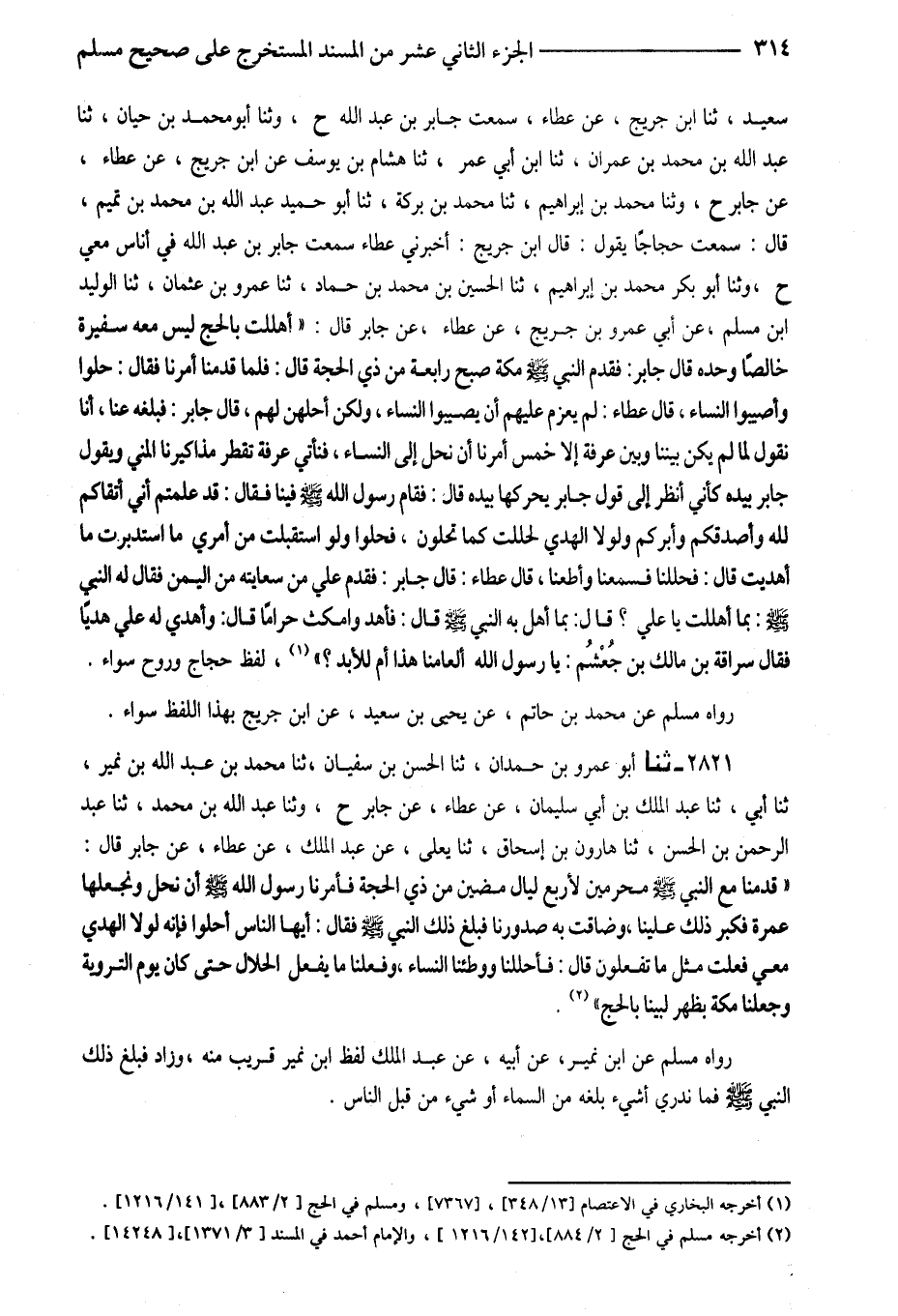 سَعِيدٍ ثَنَا ابْنُ جُرَيْجٍ عَنْ عَطَاءٌ سَمِعْتُ جَابِرَ بْنَ عَبْدِ اللَّهِ ح وَثنا أَبُو مُحَمَّدِ بْنِ حَيَّانَ ثَنَا عَبْدُ اللَّهِ بْنُ مُحَمَّدِ بْنِ عِمْرَانَ ثَنَا ابْنُ أَبِي عُمَرَ ثَنَا هِشَامٌ بْنُ يُوسُفَ عَنِ ابْنِ جُرَيْجٍ عَنْ عَطَاءٍ عَنْ جَابِرٍ ح وَثَنَا مُحَمَّدُ بْنُ إِبْرَاهِيمَ ثَنَا مُحَمَّدُ بْنُ بَرَكَةَ ثَنَا أَبُو حُمَيْدٍ عَبْدُ اللَّهِ بْنُ مُحَمَّدِ بْنِ تَمِيمٍ قَالَ سَمِعْتُ حَجَّاجًا يَقُولُ قَالَ ابْنُ جُرَيْجٍ أَخْبَرَنِي عَطَاءٌ سَمِعْتُ جَابِرَ بْنَ عَبْدِ اللَّهِ فِي أُنَاسٍ مَعِي ح وَثَنَا أَبُو بَكْرٍ مُحَمَّدُ بْنُ إِبْرَاهِيمَ ثَنَا الْحُسَيْنُ بْنُ مُحَمَّدٍ بْنِ حَمَّادٍ ثَنَا عَمْرُو بْنُ عُثْمَان ثَنَا الْوَلِيد ابْن مُسلم عَن أبي عَمْرو بن جُرَيْجٍ عَنْ عَطَاءٍ عَنْ جَابِرٍ قَالَ أَهْلَلْتُ بِالْحَجِّ لَيْسَ مَعَهُ سَفِيرَةٌ خَالِصًا وَحْدَهُ قَالَ جَابِرٌ فَقَدِمَ النَّبِيُّ صَلَّى اللَّهُ عَلَيْهِ وَسَلَّمَ مَكَّةَ صُبْحَ رَابِعَةٍ مِنْ ذِي الْحِجَّةِ قَالَ فَلَمَّا قَدِمْنَا أَمَرَنَا فَقَالَ حِلُّوا وَأَصِيبُوا النِّسَاءَ قَالَ عَطَاءٌ لَمْ يَعْزِمْ عَلَيْهِمْ أَنَّ يُصِيبُوا النِّسَاءَ وَلَكِنْ أَحَلَّهُنَّ لَهُم قَالَ جَابِرٌ فَبَلَغَهُ عَنَّا أَنَّا نَقُولُ لَمَّا لَمْ يَكُنْ بَيْنَنَا وَبَيْنَ عَرَفَةَ إِلَّا خَمْسٌ أَمَرَنَا أَنْ نَحِلَّ إِلَى النِّسَاءِ فَنَأْتِي عَرَفَةَ تَقْطُرُ مَذَاكِيرُنَا الْمَنِيَّ وَيَقُولُ جَابِرٌ بِيَدِهِ كَأَنِّي أَنْظُرُ إِلَى قَول جَابر يحركها بِيَدِهِ قَالَ فَقَامَ رَسُولُ اللَّهِ صَلَّى اللَّهُ عَلَيْهِ وَسَلَّمَ فِينَا فَقَالَ قَدْ عَلِمْتُمْ أَنِّي أَتْقَاكُمْ لِلَّهِ وَأَصْدَقُكُمْ وَأَبَرُّكُمْ وَلَوْلا الْهَدْيُ لَحَلَلْتُ كَمَا تَحِلُّونَ فَحِلُّوا وَلَوِ اسْتَقْبَلْتُ مِنْ أَمْرِي مَا اسْتَدْبَرْتُ مَا أَهْدَيْتُ قَالَ فَحَلَلْنَا فَسَمِعْنَا وَأَطَعْنَا قَالَ عَطَاءٌ قَالَ جَابِرٌ فَقَدِمَ عَلِيٌّ مِنْ سِعَايَتِهِ مِنَ الْيَمَنِ فَقَالَ لَهُ النَّبِيُّ صَلَّى اللَّهُ عَلَيْهِ وَسَلَّمَ بِمَا أَهْلَلْتَ يَا عَلِيُّ قَالَ بِمَا أَهَلَّ بِهِ النَّبِيِّ صَلَّى اللَّهُ عَلَيْهِ وَسَلَّمَ قَالَ فَأَهْدِ وَامْكُثْ حَرَامًا قَالَ وَأَهْدَى لَهُ عَلِيٌّ هَدْيًا فَقَالَ سُرَاقَةُ بْنُ مَالِكِ بْنِ جُعْشُمٍ يَا رَسُولَ اللَّهِ أَلِعَامِنَا هَذَا أَمْ لِلأَبَدِ لَفْظُ حَجَّاجٍ وَرَوْحٍ سَوَاءٌ