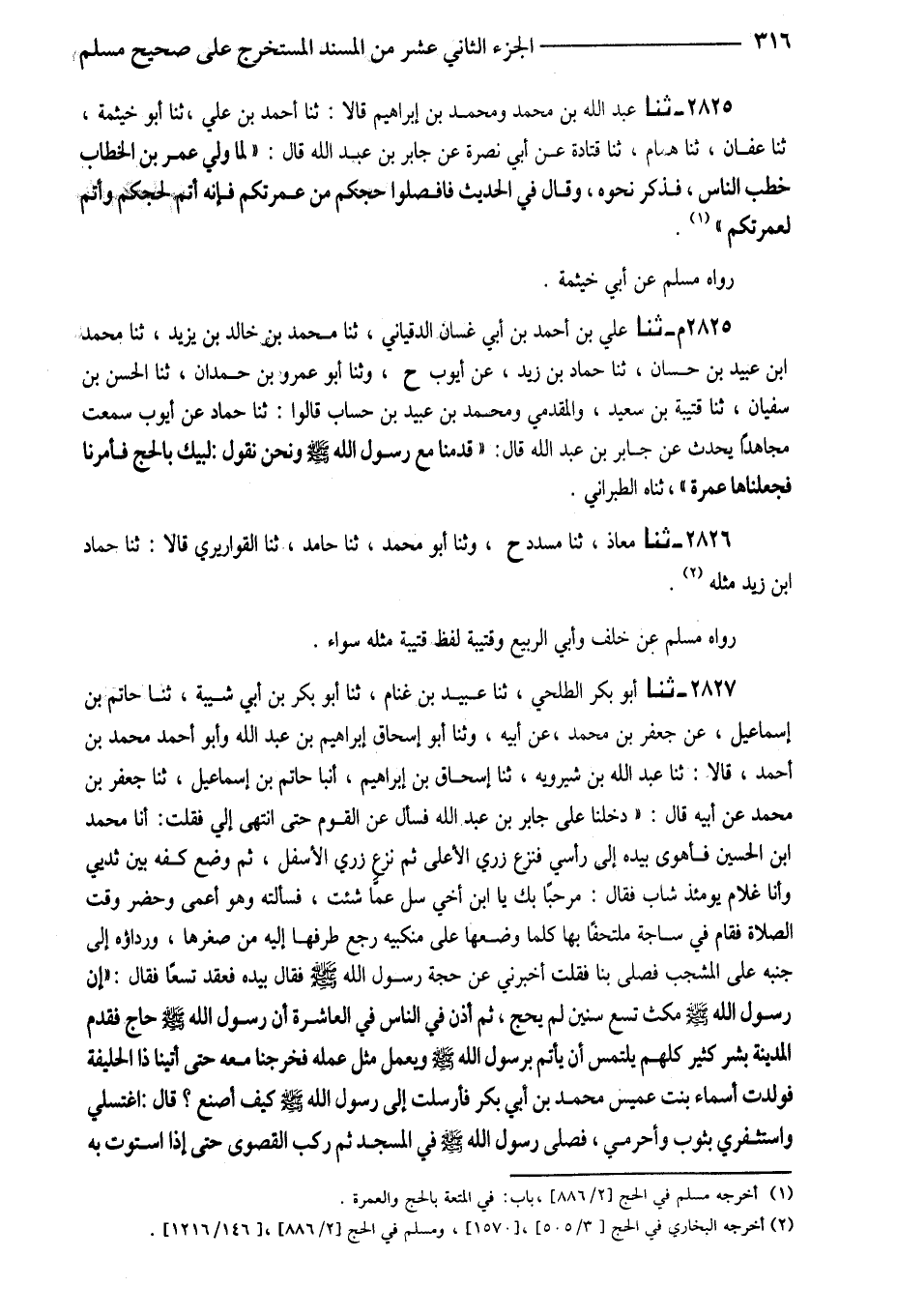 2827 - ثَنَا أَبُو بَكْرٍ الطَّلْحِيُّ ثَنَا عُبَيْدُ بْنُ غَنَّامٍ ثَنَا أَبُو بَكْرِ بْنُ أَبِي شَيْبَةَ ثَنَا حَاتِمُ بْنُ إِسْمَاعِيلَ عَنْ جَعْفَرِ بْنِ مُحَمَّدٍ عَنْ أَبِيهِ وَثنا أَبُو إِسْحَاقَ إِبْرَاهِيمُ بْنُ عَبْدِ اللَّهِ وَأَبُو أَحْمَدَ مُحَمَّدُ بْنُ أَحْمَدَ قَالا ثَنَا عَبْدُ اللَّهِ بْنُ شِيرَوَيْهِ ثَنَا إِسْحَاقُ بْنُ إِبْرَاهِيمَ أَنْبَا حَاتِمُ بْنُ إِسْمَاعِيلَ ثَنَا جَعْفَرُ بْنُ مُحَمَّدٍ عَنْ أَبِيهِ قَالَ دَخَلْنَا عَلَى جَابِرِ بْنِ عَبْدِ اللَّهِ فَسَأَلَ عَنِ الْقَوْمِ حَتَّى انْتَهَى إِلَيَّ فَقُلْتُ أَنَا مُحَمَّدُ ابْن الْحُسَيْنِ فَأَهْوَى بِيَدِهِ إِلَى رَأْسِي فَنَزَعَ زِرِّي الأَعْلَى ثُمَّ نَزَعَ زِرِّي الأَسْفَلَ ثُمَّ وَضَعَ كَفَّهُ بَيْنَ ثَدْيَيَّ وَأَنَا غُلامٌ يَوْمَئِذٍ شَابٌّ فَقَالَ مَرْحَبًا بِكَ يَا ابْنَ أَخِي سَلْ عَمَّا شِئْتَ فَسَأَلْتُهُ وَهُوَ أَعْمَى وَحَضَرَ وَقْتُ الصَّلَاة فَقَامَ فِي ساجة مُلْتَحِفًا بِهَا كُلَّمَا وَضَعَهَا عَلَى مَنْكِبَيْهِ رَجَعَ طَرَفُهَا إِلَيْهِ مِنْ صِغَرِهَا وَرِدَاؤُهُ إِلَى جَنْبِهِ عَلَى الْمِشْجَبِ فَصَلَّى بِنَا فَقُلْتُ أَخْبِرْنِي عَنْ حَجَّةِ رَسُولِ اللَّهِ صَلَّى اللَّهُ عَلَيْهِ وَسَلَّمَ فَقَالَ بِيَدِهِ فَعَقَدَ تِسْعًا فَقَالَ إِنَّ رَسُولَ اللَّهِ صَلَّى اللَّهُ عَلَيْهِ وَسَلَّمَ مَكَثَ تِسْعَ سِنِينَ لَمْ يَحُجَّ ثُمَّ أَذَّنَ فِي النَّاسِ فِي الْعَاشِرَةِ أَنَّ رَسُولَ اللَّهِ صَلَّى اللَّهُ عَلَيْهِ وَسَلَّمَ حَاجٌّ فَقَدِمَ الْمَدِينَةَ بَشَرٌ كَثِيرٌ كُلُّهُمْ يَلْتَمِسُ أَنْ يَأْتَمَّ بِرَسُولِ اللَّهِ صَلَّى اللَّهُ عَلَيْهِ وَسَلَّمَ وَيَعْمَلُ مِثْلَ عَمَلِهِ فَخَرَجْنَا مَعَهُ حَتَّى أَتَيْنَا ذَا الْحُلَيْفَةِ فَوَلَدَتْ أَسْمَاءُ بِنْتُ عُمَيْسٍ مُحَمَّدَ بْنَ أَبِي بَكْرٍ فَأَرْسَلَتْ إِلَى رَسُولِ اللَّهِ صَلَّى اللَّهُ عَلَيْهِ وَسَلَّمَ كَيْفَ أَصْنَعُ قَالَ اغْتَسِلِي وَاسْتَثْفِرِي بِثَوْبٍ وَأَحْرِمِي فَصَلَّى رَسُولُ اللَّهِ صَلَّى اللَّهُ عَلَيْهِ وَسَلَّمَ فِي الْمَسْجِدِ ثُمَّ رَكِبَ الْقَصْوَى حَتَّى إِذَا اسْتَوَتْ بِهِ