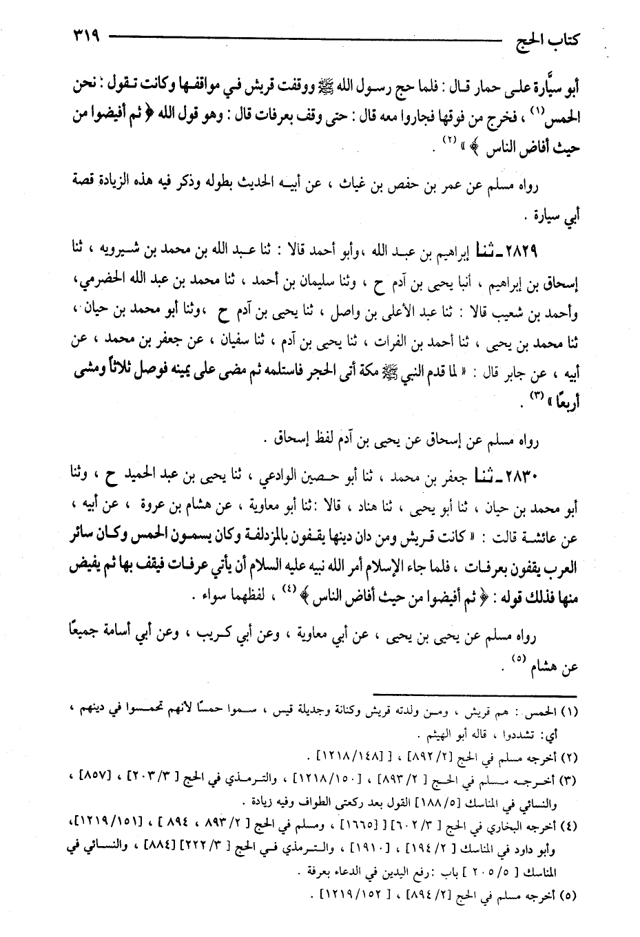 2830 - ثَنَا جَعْفَرُ بْنُ مُحَمَّدٍ ثَنَا أَبُو حُصَيْنٍ الْوَادِعِيُّ ثَنَا يَحْيَى بْنُ عَبْدِ الْحَمِيدِ ح وَثنا أَبُو مُحَمَّدِ بْنُ حَيَّانَ ثَنَا أَبُو يَحْيَى ثَنَا هَنَّادٌ قَالا ثَنَا أَبُو مُعَاوِيَةَ عَنْ هِشَامِ بْنِ عُرْوَةَ عَنْ أَبِيهِ عَنْ عَائِشَةَ قَالَتْ كَانَتْ قُرَيْشٌ وَمَنْ دَانَ دِينَهَا يقفون بِالْمُزْدَلِفَةِ وَكَانَ يُسَمَّوْنَ الْحُمْسَ وَكَانَ سَائِرُ الْعَرَبِ يَقِفُونَ بِعَرَفَاتٍ فَلَمَّا جَاءَ الْإِسْلامُ أَمَرَ اللَّهُ نَبِيَّهُ عَلَيْهِ السَّلامُ أَنْ يَأْتِيَ عَرَفَاتٍ فَيَقِفَ بِهَا ثُمَّ يُفِيضَ مِنْهَا فَذَلِكَ قَوْلُهُ {ثُمَّ أَفِيضُوا مِنْ حَيْثُ أَفَاضَ النَّاس} لَفْظُهُمَا سَوَاءٌ