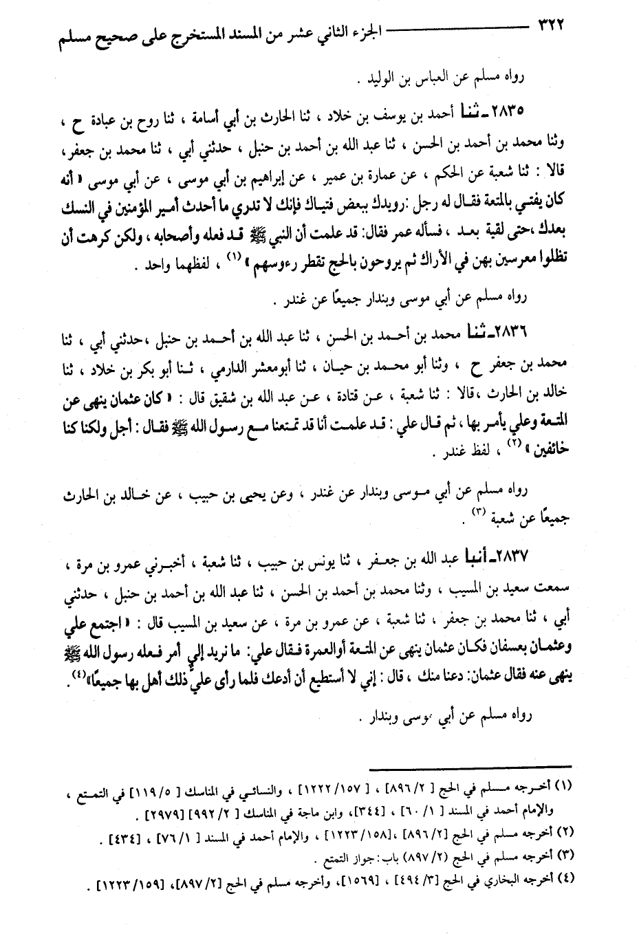 2837 - أَنْبَأَ عَبْدُ اللَّهِ بْنُ جَعْفَرٍ ثَنَا يُونسُ بن حبيب ثَنَا شُعْبَةُ أَخْبَرَنِي عَمْرُو بْنُ مُرَّةَ سَمِعْتُ سَعِيدَ بْنَ الْمُسَيِّبِ وثنا مُحَمَّدُ بْنُ أَحْمَدَ بْنِ الْحَسَنِ ثَنَا عَبْدُ اللَّهِ بْنُ أَحْمَدَ بْنِ حَنْبَلٍ حَدَّثَنِي أَبِي ثَنَا مُحَمَّدُ بْنُ جَعْفَرٍ ثَنَا شُعْبَةُ عَنْ عَمْرِو بْنِ مُرَّةَ عَنْ سَعِيدِ بْنِ الْمُسَيِّبِ قَالَ اجْتَمَعَ عَلِيٌّ وَعُثْمَانُ بِعُسْفَانَ فَكَانَ عُثْمَانُ يَنْهَى عَنِ الْمُتْعَةِ أَوِ الْعمرَة فَقَالَ عَليّ مَا نُرِيد إِلَى أَمْرٍ فَعَلَهُ رَسُولُ اللَّهِ صَلَّى اللَّهُ عَلَيْهِ وَسَلَّمَ يَنْهَى عَنْهُ فَقَالَ عُثْمَانُ دَعْنَا مِنْكَ قَالَ إِنِّي لَا أَسْتَطِيعُ أَنْ أَدَعَكَ فَلَمَّا رَأَى عَلِيٌّ ذَلِكَ أَهَلَّ بِهَا جَمِيعًا