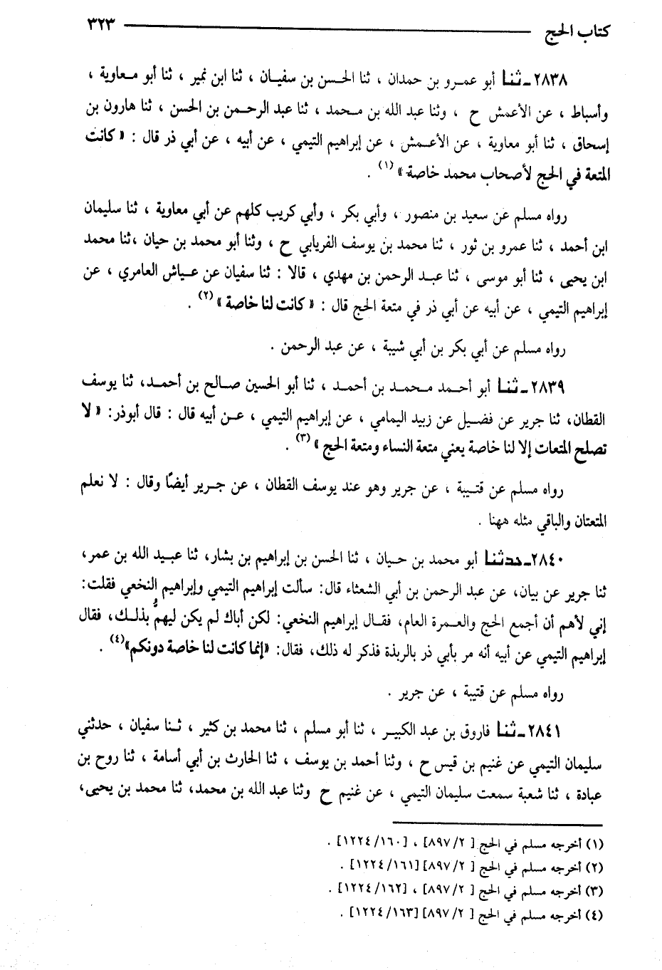 رَوَاهُ مُسْلِمٌ عَنْ سَعِيدِ بْنِ مَنْصُورٍ وَأَبِي بَكْرٍ وَأَبِي كُرَيْبٍ كُلُّهُمْ عَنْ أَبِي مُعَاوِيَةَ ثَنَا سُلَيْمَانُ ابْن أَحْمَدَ ثَنَا عَمْرُو بْنُ ثَوْرٍ ثَنَا مُحَمَّدُ بْنُ يُوسُفَ الْفِرْيَابِيُّ ح وَثَنَا أَبُو مُحَمَّدِ بْنُ حَيَّان ثَنَا مُحَمَّد ابْن يَحْيَى ثَنَا أَبُو مُوسَى ثَنَا عَبْدُ الرَّحْمَنِ بْنُ مَهْدِيٍّ قَالا ثَنَا سُفْيَانُ عَنِ عَيَّاشٍ الْعَامِرِيِّ عَنْ إِبْرَاهِيمَ التَّيْمِيِّ عَنْ أَبِيهِ عَنْ أَبِي ذَرٍّ فِي مُتْعَةِ الْحَج قَالَ كَانَتْ لَنَا خَاصَّةً