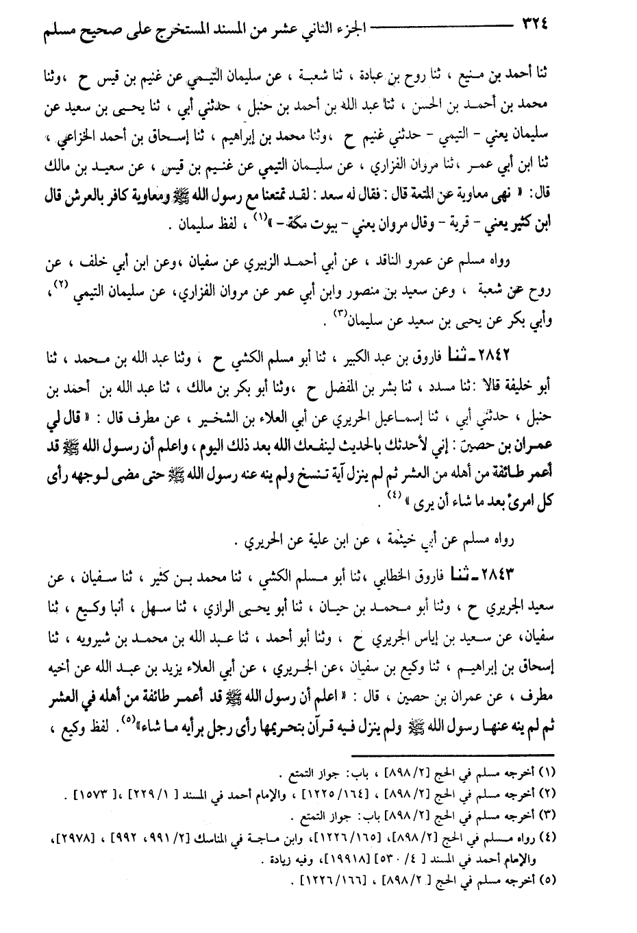 ثَنَا أَحْمَدُ بْنُ مَنِيعٍ ثَنَا رَوْحُ بْنُ عُبَادَةَ ثَنَا شُعْبَةُ عَنْ سُلَيْمَانَ التَّيْمِيِّ عَنْ غُنَيْمِ بْنِ قَيْسٍ ح وَثنا مُحَمَّدُ بْنُ أَحْمَدَ بْنِ الْحَسَنِ ثَنَا عَبْدُ اللَّهِ بْنُ أَحْمَدَ بْنِ حَنْبَلٍ حَدَّثَنِي أَبِي ثَنَا يَحْيَى بْنُ سَعِيدٍ عَنْ سُلَيْمَانَ يَعْنِي التَّيْمِيَّ حَدَّثَنِي غُنَيْمٌ ح وَثنا مُحَمَّدُ بْنُ إِبْرَاهِيمَ ثَنَا إِسْحَاقُ بْنُ أَحْمَدَ الْخُزَاعِيُّ ثَنَا ابْنُ أَبِي عُمَرَ ثَنَا مَرْوَانُ الْفَزَارِيُّ عَنْ سُلَيْمَانَ التَّيْمِيِّ عَنْ غُنَيْمِ بْنِ قَيْسٍ عَنْ سَعِيدِ بْنِ مَالِكٍ قَالَ نَهَى مُعَاوِيَةُ عَنِ الْمُتْعَةِ قَالَ فَقَالَ لَهُ سَعْدٌ لَقَدْ تَمَتَّعْنَا مَعَ رَسُولِ اللَّهِ صَلَّى اللَّهُ عَلَيْهِ وَسَلَّمَ وَمُعَاوِيَةٌ كَافِرٌ بِالْعُرُشِ قَالَ ابْنُ كَثِيرٍ يَعْنِي قَرْيَةً وَقَالَ مَرْوَانُ يَعْنِي بُيُوتَ مَكَّةَ لَفْظُ سُلَيْمَانَ