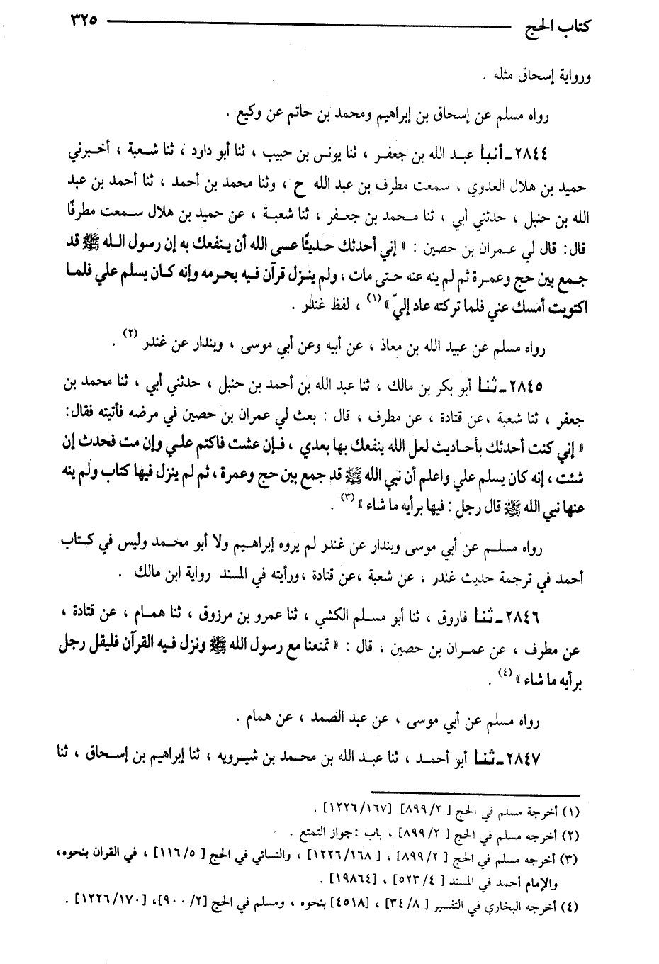 2844 - أَنْبَأَ عَبْدُ اللَّهِ بْنُ جَعْفَرٍ ثَنَا يُونسُ بْنُ حَبِيبٍ ثَنَا أَبُو دَاوُدَ ثَنَا شُعْبَةُ أَخْبَرَنِي حُمَيْدُ بْنُ هِلالٍ الْعَدَوِيُّ سَمِعْتُ مُطَرِّفَ بْنُ عَبْدِ اللَّهِ ح وثنا مُحَمَّدُ بْنُ أَحْمَدَ ثَنَا أَحْمَدُ بْنُ عَبْدِ اللَّهِ بْنِ حَنْبَلٍ حَدَّثَنِي أَبِي ثَنَا مُحَمَّدُ بْنُ جَعْفَرٍ ثَنَا شُعْبَةُ عَنْ حُمَيْدِ بْنِ هِلالٍ سَمِعْتُ مُطَرِّفًا قَالَ قَالَ لِي عِمْرَانُ بْنُ حُصَيْنٍ إِنِّي أُحَدِّثُكَ حَدِيثًا عَسَى اللَّهُ أَنْ يَنْفَعَكَ بِهِ إِنَّ رَسُولَ اللَّهِ صَلَّى اللَّهُ عَلَيْهِ وَسَلَّمَ قَدْ جَمَعَ بَيْنَ حَجٍّ وَعُمْرَةٍ ثُمَّ لَمْ يَنْهَ عَنْهُ حَتَّى مَاتَ وَلَمْ يَنْزِلْ قُرْآنٌ فِيهِ يُحَرِّمُهُ وَإِنَّهُ كَانَ يُسَلَّمُ عَلَيَّ فَلَمَّا اكْتَوَيْتُ أُمْسِكَ عَنِّي فَلَمَّا تَرَكْتُهُ عَادَ إِلَيَّ لَفْظُ غُنْدَرٍ