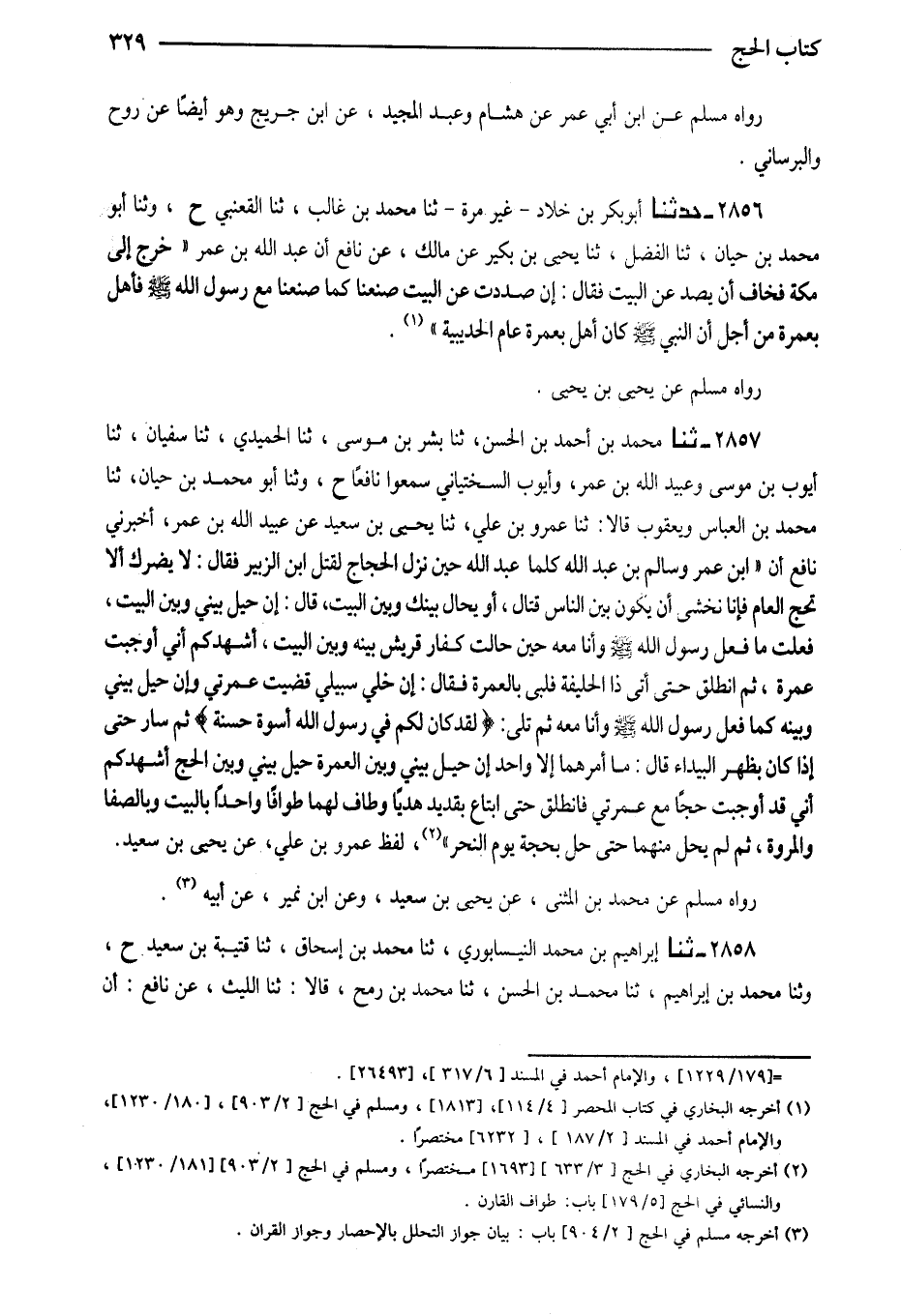 2857 - ثَنَا مُحَمَّدُ بْنُ أَحْمَدَ بْنِ الْحَسَنِ ثَنَا بِشْرُ بْنُ مُوسَى ثَنَا الْحُمَيْدِيُّ ثَنَا سُفْيَانُ ثَنَا أَيُّوبُ بْنُ مُوسَى وَعُبَيْدُ اللَّهِ بْنُ عُمَرَ وَأَيُّوبُ السَّخْتِيَانِيُّ سَمِعُوا نَافِعًا ح وَثَنَا أَبُو مُحَمَّدِ بْنُ حَيَّانَ ثَنَا مُحَمَّدُ بْنُ الْعَبَّاسِ وَيَعْقُوبُ قَالا ثَنَا عَمْرُو بْنُ عَلِيٍّ ثَنَا يَحْيَى بْنُ سَعِيدٍ عَنْ عُبَيْدِ اللَّهِ بْنِ عُمَرَ أَخْبَرَنِي نَافِعٌ أَنَّ ابْنَ عُمَرَ وَسَالِمَ بْنَ عَبْدِ اللَّهِ كَلَّمَا عَبْدَ اللَّهِ حِينَ نَزَلَ الْحَجَّاجُ لِقَتْلِ ابْنِ الزُّبَيْرِ فَقَالَ لَا يَضُرُّكَ أَلَّا تَحُجَّ الْعَامَ فَإِنَّا نَخْشَى أَنْ يَكُونَ بَيْنَ النَّاسِ قِتَالٌ أَوْ يُحَالُ بَيْنَكَ وَبَيْنَ الْبَيْتِ قَالَ إِنْ حِيلَ بَيْنِي وَبَيْنَ الْبَيْتِ فَعَلْتُ مَا فَعَلَ رَسُولُ اللَّهِ صَلَّى اللَّهُ عَلَيْهِ وَسَلَّمَ وَأَنَا مَعَهُ حِينَ حَالَتْ كُفَّارُ قُرَيْشٍ بَيْنَهُ وَبَيْنَ الْبَيْتِ أُشْهِدُكُمْ أَنِّي أَوْجَبْتُ عُمْرَةً ثُمَّ انْطَلَقَ حَتَّى أَتَى ذَا الْحُلَيْفَةِ فَلَبَّى بِالْعُمْرَةِ فَقَالَ إِنْ خُلِّيَ سَبِيلِي قَضَيْتُ عُمْرَتِي وَإِنْ حِيلَ بيني وَبَينه كَمَا فَعَلَ رَسُولُ اللَّهِ صَلَّى اللَّهُ عَلَيْهِ وَسَلَّمَ وَأَنَا مَعَهُ ثُمَّ تَلا {لَقَدْ كَانَ لَكُمْ فِي رَسُولِ اللَّهِ أُسْوَةٌ حَسَنَةٌ} ثُمَّ سَارَ حَتَّى إِذَا كَانَ بِظَهْرِ الْبَيْدَاءِ قَالَ مَا أَمْرَهُمَا إِلَّا وَاحِدٌ إِنْ حِيلَ بَيْنِي وَبَيْنَ الْعُمْرَةِ حِيلَ بَيْنِي وَبَيْنَ الْحَجِّ أُشْهِدُكُمْ أَنِّي قَدْ أَوْجَبْتُ حَجًّا مَعَ عُمْرَتِي فَانْطَلَقَ حَتَّى ابْتَاعَ بِقُدَيْدٍ هَدْيًا وَطَافَ لَهُمَا طَوَافًا وَاحِدًا بِالْبَيْتِ وَبِالصَّفَا وَالْمَرْوَةِ ثُمَّ لَمْ يَحِلَّ مِنْهُمَا حَتَّى حَلَّ بِحَجَّةٍ يَوْمَ النَّحْرِ لَفْظُ عَمْرِو بْنِ عَلِيٍّ عَنْ يَحْيَى بْنِ سَعِيدٍ