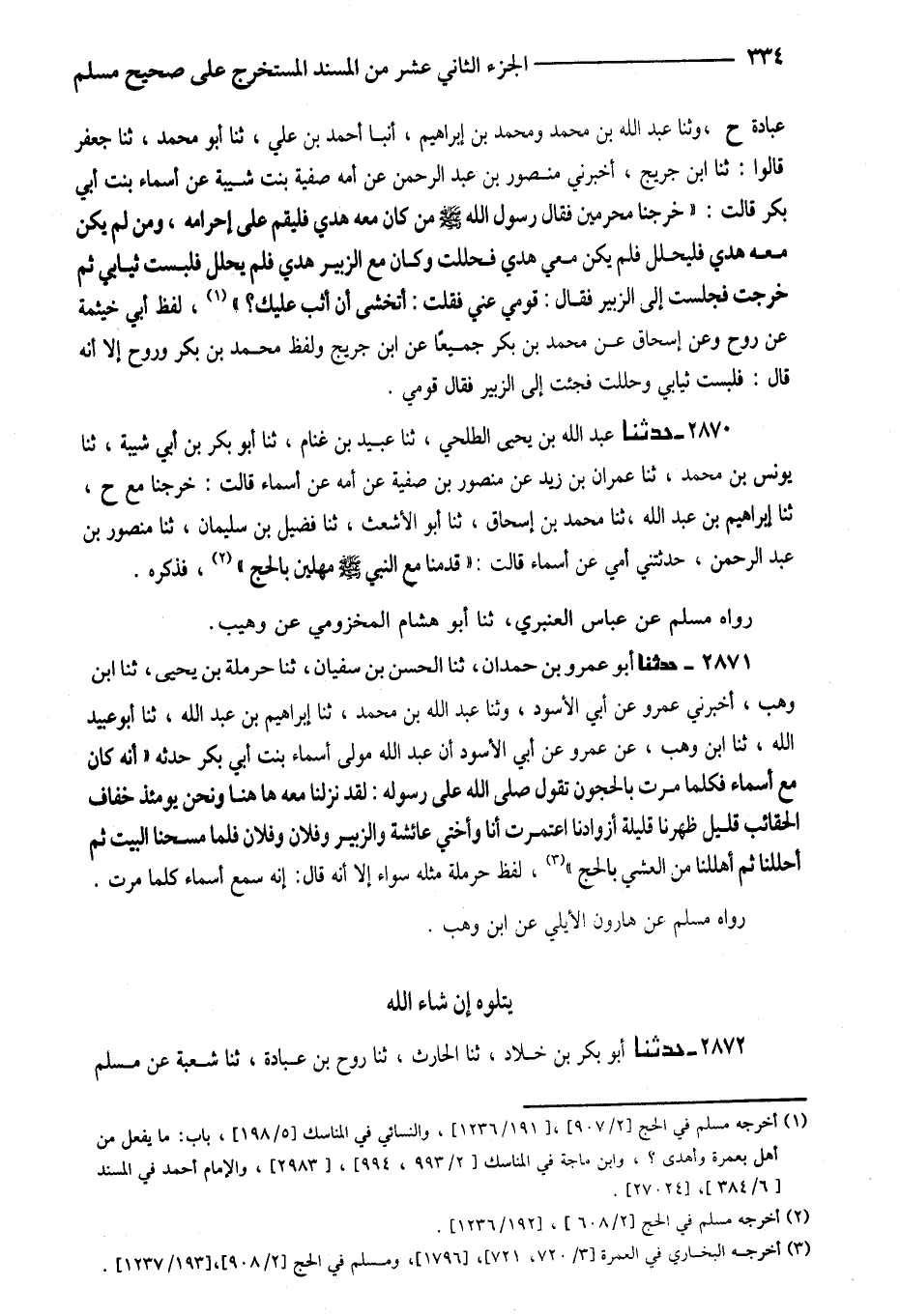 2871 - حَدَّثَنَا أَبُو عَمْرِو بْنُ حَمْدَانَ ثَنَا الْحَسَنُ بْنُ سُفْيَانَ ثَنَا حَرْمَلَةُ بْنُ يَحْيَى ثَنَا ابْنُ وَهْبٍ أَخْبَرَنِي عَمْرٌو عَنْ أَبِي الأَسْوَدِ وَثنا عَبْدُ اللَّهِ بْنُ مُحَمَّدٍ ثَنَا إِبْرَاهِيمُ بْنُ عَبْدِ اللَّهِ ثَنَا أَبُو عُبَيْدِ اللَّهِ ثَنَا ابْنُ وَهْبٍ عَنْ عَمْرٍو عَنْ أَبِي الأَسْوَدِ أَنَّ عَبْدَ اللَّهِ مَوْلَى أَسْمَاءَ بِنْتِ أَبِي بَكْرٍ حَدَّثَهُ أَنَّهُ كَانَ مَعَ أَسْمَاءَ فَكُلَّمَا مَرَّتْ بِالْحَجُونِ تَقُولُ صَلَّى اللَّهُ عَلَى رَسُولِهِ لقد نزلنَا مَعَه هَا هُنَا وَنَحْنُ يَوْمَئِذٍ خِفَافُ الْحَقَائِبِ قَلِيلٌ ظَهْرُنَا قَلِيلَةٌ أَزْوَادُنَا اعْتَمَرْتُ أَنَا وَأُخْتِي عَائِشَةُ وَالزُّبَيْرُ وَفُلانٌ وَفُلانٌ فَلَمَّا مَسَحْنَا الْبَيْتَ ثُمَّ أَحْلَلْنَا ثُمَّ أَهْلَلْنَا مِنَ الْعَشِيِّ بِالْحَجِّ لَفْظُ حَرْمَلَةَ مِثْلُهُ سَوَاءٌ إِلَّا أَنَّهُ قَالَ إِنَّهُ سَمِعَ أَسْمَاءَ كُلَّمَا مَرَّتْ
