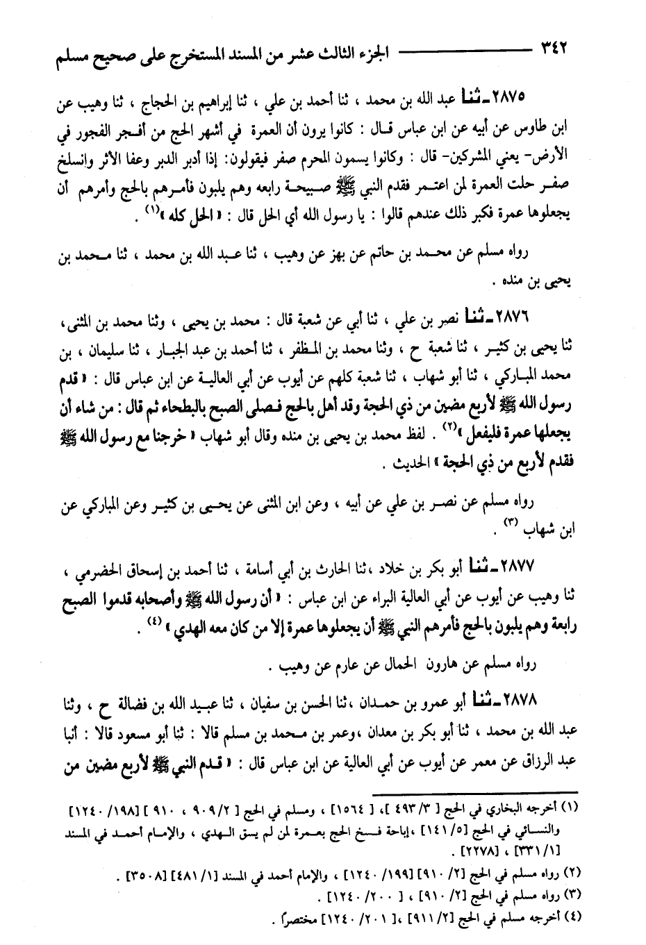 2875 - ثَنَا عَبْدُ اللَّهِ بْنُ مُحَمَّدِ ثَنَا أَحْمَدُ بْنُ عَلِيٍّ ثَنَا إِبْرَاهِيمُ بْنُ الْحَجَّاجِ ثَنَا وُهَيْبٌ عَنِ ابْنِ طَاوُسٍ عَنْ أَبِيهِ عَنِ ابْنِ عَبَّاسٍ قَالَ كَانُوا يَرَوْنَ أَنَّ الْعُمْرَةَ فِي أَشْهُرِ الْحَجِّ مِنْ أَفْجَرِ الْفُجُورِ فِي الأَرْضِ يَعْنِي الْمُشْرِكِينَ قَالَ وَكَانُوا يسمون الْمحرم صفر فَيَقُولُونَ إِذا أدبر الدَّبَرُ وَعَفَا الأَثَرُ وَانْسَلَخَ صَفَرُ حَلَّتِ الْعُمْرَةُ لِمَنِ اعْتَمَرَ فَقَدِمَ النَّبِيِّ صَلَّى اللَّهُ عَلَيْهِ وَسَلَّمَ صَبِيحَةَ رَابِعِهِ وَهُمْ يُلَبُّونَ فَأَمَرَهُمْ بِالْحَجِّ وَأَمَرَهُمْ أَنْ يَجْعَلُوهَا عُمْرَةً فَكَبُرَ ذَلِكَ عِنْدَهُمْ قَالُوا يَا رَسُولَ اللَّهِ أَيُّ الْحِلِّ قَالَ الْحِلُّ كُلُّهُ
