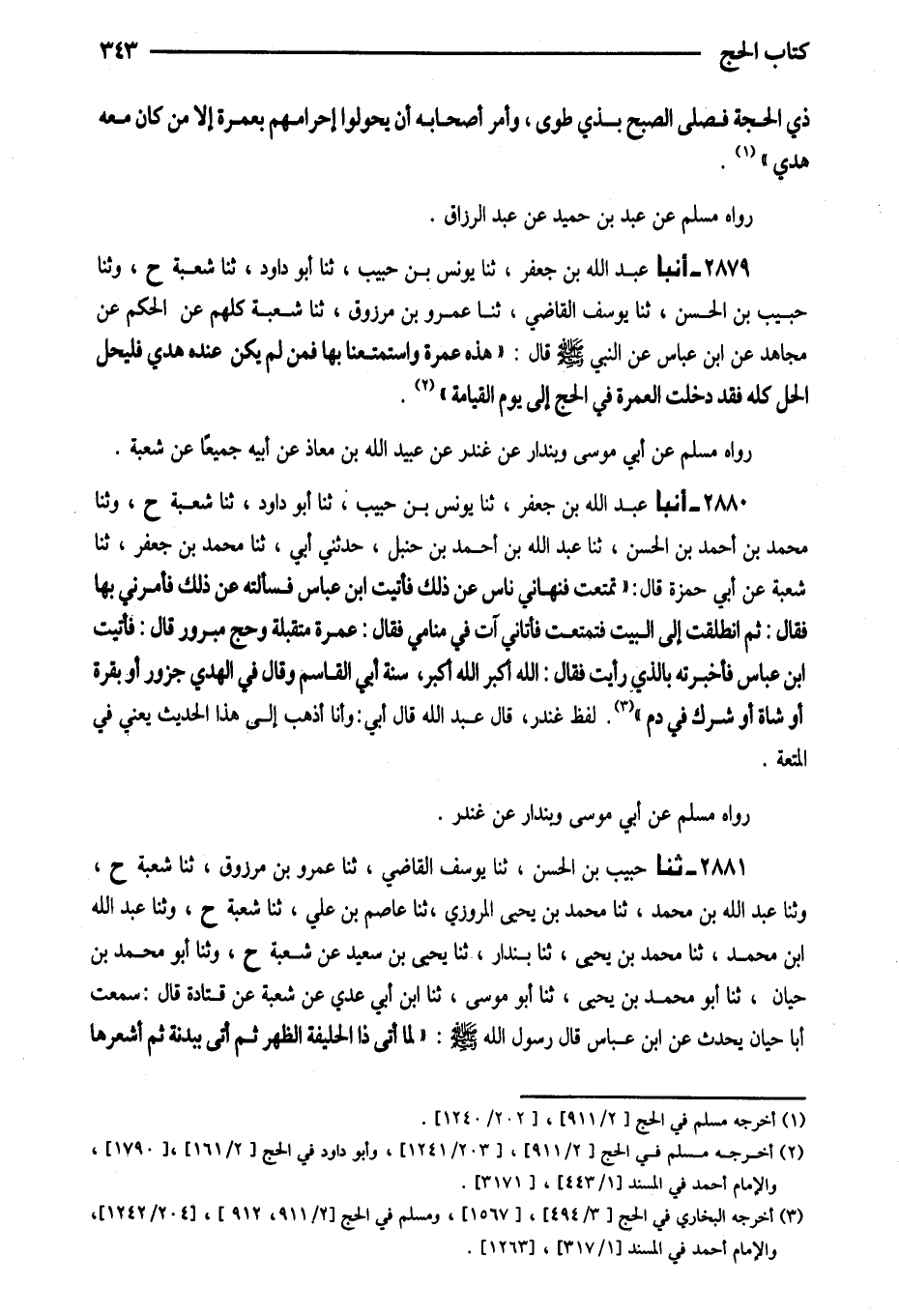 2879 - أَنْبَأَ عَبْدُ اللَّهِ بْنُ جَعْفَرٍ ثَنَا يُونسُ بْنُ حَبِيبٍ ثَنَا أَبُو دَاوُدَ ثَنَا شُعْبَةُ ح وَثَنَا حَبِيبُ بْنُ الْحَسَنِ ثَنَا يُوسُفُ الْقَاضِي ثَنَا عَمْرُو بْنُ مَرْزُوقٍ ثَنَا شُعْبَةُ كُلُّهُمْ عَنِ الْحَكَمِ عَنْ مُجَاهِدٍ عَنْ ابْنِ عَبَّاسٍ عَنِ النَّبِيِّ صَلَّى اللَّهُ عَلَيْهِ وَسَلَّمَ قَالَ هَذِهِ عُمْرَةٌ وَاسْتَمْتَعْنَا بِهَا فَمَنْ لَمْ يَكُنْ عِنْدَهُ هَدْيٌ فَلْيَحِلَّ الْحِلَّ كُلَّهُ فَقَدْ دَخَلَتِ الْعُمْرَةُ فِي الْحَجِّ إِلَى يَوْمِ الْقِيَامَةِ