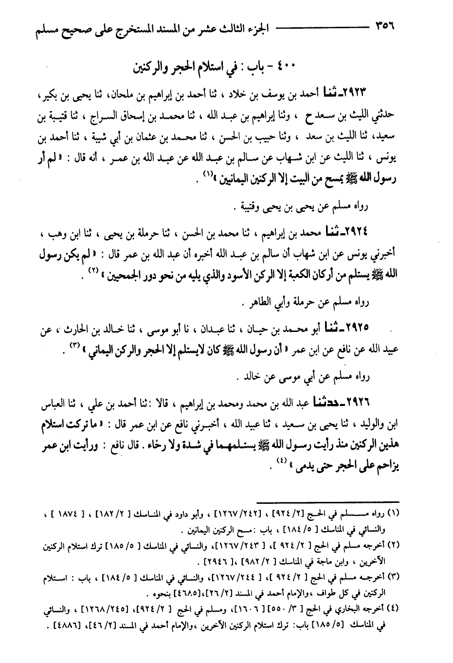 2923 - ثَنَا أَحْمَدُ بْنُ يُوسُفَ بْنِ خَلادٍ ثَنَا أَحْمَدُ بْنُ إِبْرَاهِيمَ بْنِ مِلْحَانَ ثَنَا يَحْيَى بْنُ بُكَيْرٍ حَدَّثَنِي اللَّيْثُ بْنُ سَعْدٍ ح وَثنا إِبْرَاهِيمُ بْنُ عَبْدِ اللَّهِ ثَنَا مُحَمَّدُ بْنُ إِسْحَاقَ السَّرَّاجُ ثَنَا قُتَيْبَةُ بْنُ سَعِيدٍ ثَنَا اللَّيْثُ بْنُ سَعْدٍ وَثَنَا حَبِيبُ بْنُ الْحَسَنِ ثَنَا مُحَمَّدُ بْنُ عُثْمَانَ بْنِ أَبِي شَيْبَةَ ثَنَا أَحْمَدُ بْنُ يُونُسَ ثَنَا اللَّيْثُ عَنِ ابْنِ شِهَابٍ أَنَّ سَالِمِ بْنِ عَبْدِ اللَّهِ عَنْ عَبْدِ اللَّهِ بْنِ عُمَرَ أَنَّهُ قَالَ (لَمْ أَرَ رَسُولَ اللَّهِ صَلَّى اللَّهُ عَلَيْهِ وَسَلَّمَ يَمْسَحُ مِنَ الْبَيْتِ إِلَّا الرُّكْنَيْنِ الْيَمَانِيَّيْنِ)