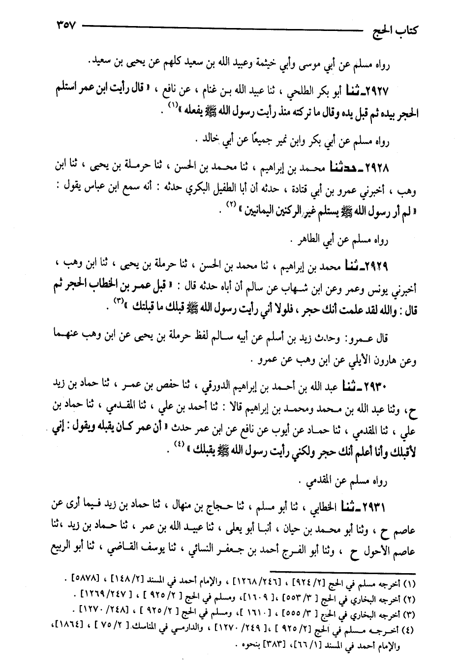 2930 - ثَنَا عَبْدُ اللَّهِ بْنُ أَحْمَدَ بْنِ إِبْرَاهِيمَ الدَّوْرَقِيُّ ثَنَا حَفْصُ بْنُ عُمَرَ ثَنَا حَمَّادُ بْنُ زَيْدٍ ح وَثنا عَبْدُ اللَّهِ بْنُ مُحَمَّدٍ وَمُحَمَّدُ بْنُ إِبْرَاهِيمَ قَالا ثَنَا أَحْمَدُ بْنُ عَلِيٍّ ثَنَا الْمُقَدَّمِيُّ ثَنَا حَمَّاد بْنُ عَلِيٍّ ثَنَا الْمُقَدَّمِيُّ ثَنَا حَمَّادٌ عَنْ أَيُّوبَ عَنْ نَافِعٍ عَنِ ابْنِ عُمَرَ حَدَّثَ أَنَّ عُمَرَ كَانَ يُقَبِّلُهُ وَيَقُولُ إِنِّي لَأُقَبِّلُكَ وَأَنَا أَعْلَمُ أَنَّكَ حَجَرٌ وَلَكِنِّي رَأَيْتُ رَسُولَ اللَّهِ صَلَّى اللَّهُ عَلَيْهِ وَسَلَّمَ يُقَبِّلُكَ