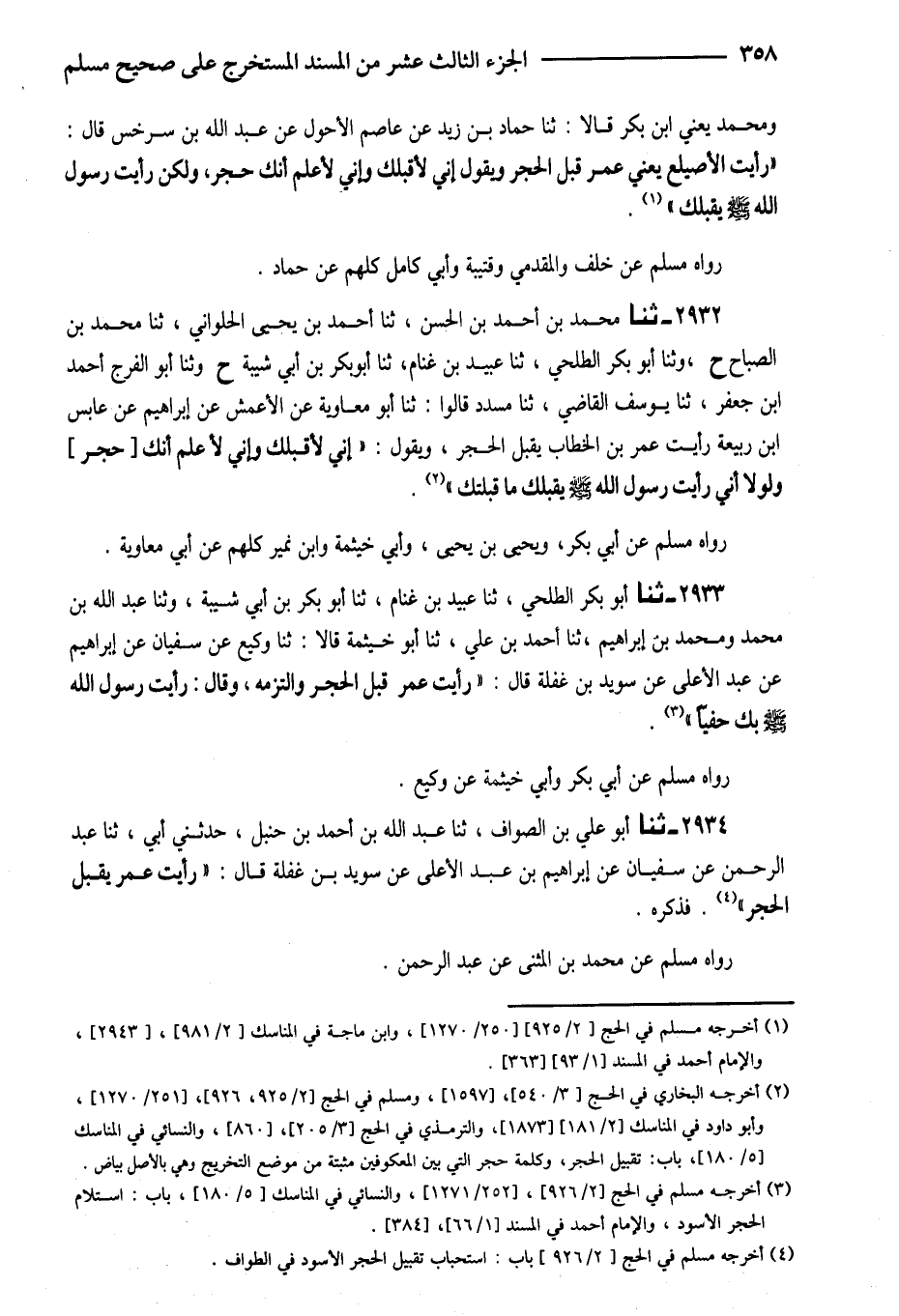 2932 - ثَنَا مُحَمَّدُ بْنُ أَحْمَدَ بْنِ الْحَسَنِ ثَنَا أَحْمَدُ بْنُ يَحْيَى الْحُلْوَانِيُّ ثَنَا مُحَمَّدُ بْنُ الصَّبَّاحِ ح وَثنا أَبُو بَكْرٍ الطَّلْحِيُّ ثَنَا عُبَيْدُ بْنُ غَنَّامٍ ثَنَا أَبُو بَكْرِ بْنُ أَبِي شَيْبَةَ ح وثنا أَبُو الْفرج أَحْمد ابْن جَعْفَرٍ ثَنَا يُوسُفُ الْقَاضِي ثَنَا مُسَدَّدٌ قَالُوا ثَنَا أَبُو مُعَاوِيَةَ عَنِ الأَعْمَشِ عَنْ إِبَرْاهِيمَ عَنْ عَابس ابْن رَبِيعَةَ رَأَيْتُ عُمَرَ بْنَ الْخَطَّابِ يُقَبِّلُ الْحَجَرَ وَيَقُولُ إِنِّي لَأُقَبِّلُكَ وَإِنِّي لَأَعْلَمُ أَنَّكَ حَجَرٌ وَلَوْلا أَنِّي رَأَيْتُ رَسُولَ اللَّهِ صَلَّى اللَّهُ عَلَيْهِ وَسَلَّمَ يُقَبِّلُكَ مَا قَبَّلْتُكَ رَوَاهُ مُسْلِمٌ عَنْ أَبِي بَكْرٍ وَيَحْيَى بْنِ يَحْيَى وَأَبِي خَيْثَمَةَ وَابْنِ نُمَيْرٍ كُلُّهُمْ عَنْ أَبِي مُعَاوِيَةَ