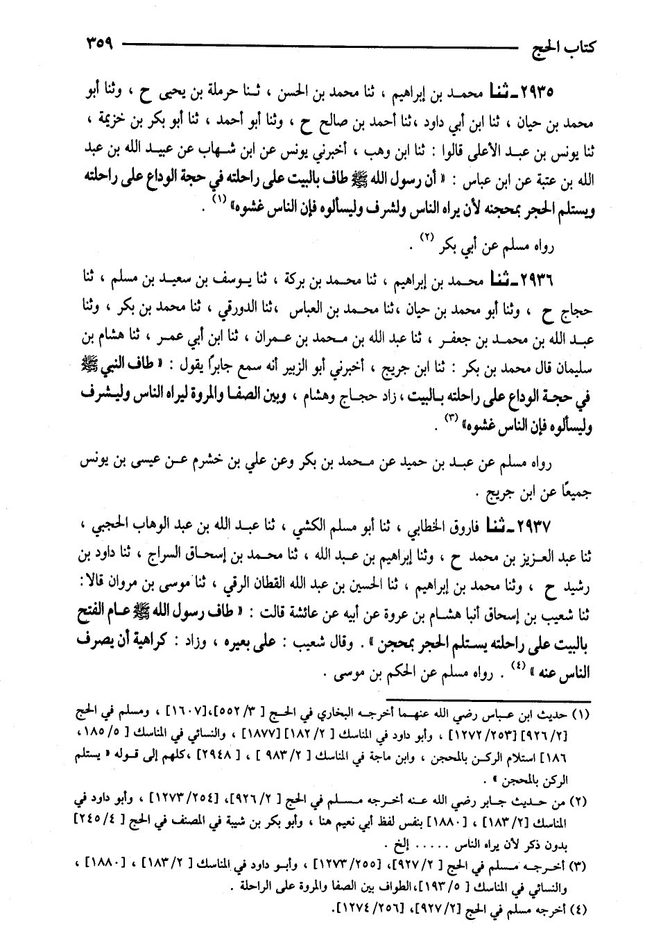 2935 - ثَنَا مُحَمَّدُ بْنُ إِبْرَاهِيمَ ثَنَا مُحَمَّدُ بْنُ الْحَسَنِ ثَنَا حَرْمَلَةُ بْنُ يَحْيَى ح وثنا أَبُو مُحَمَّدِ بْنُ حَيَّانَ ثَنَا ابْنُ أَبِي دَاوُدَ ثَنَا أَحْمَدُ بْنُ صَالِحٍ ح وَثَنَا أَبُو أَحْمَدَ ثَنَا أَبُو بَكْرِ بْنُ خُزَيْمَةَ ثَنَا يُونُسُ بْنُ عَبْدِ الأَعْلَى قَالُوا ثَنَا ابْنُ وَهْبٍ أَخْبَرَنِي يُونُسُ عَنِ ابْنِ شِهَابٍ عَنْ عُبَيْدِ اللَّهِ بْنِ عَبْدِ اللَّهِ بْنِ عُتْبَةَ عَنِ ابْنِ عَبَّاسٍ أَنَّ رَسُولَ اللَّهِ صَلَّى اللَّهُ عَلَيْهِ وَسَلَّمَ طَافَ بِالْبَيْتِ عَلَى رَاحِلَتِهِ فِي حَجَّةِ الْوَدَاعِ عَلَى رَاحِلَتِهِ وَيَسْتَلِمُ الْحَجَرَ بِمِحْجَنِهِ لِأَن يرَاهُ النَّاس ولشرف وَلِيَسْأَلُوهُ فَإِنَّ النَّاسَ غَشُوهُ