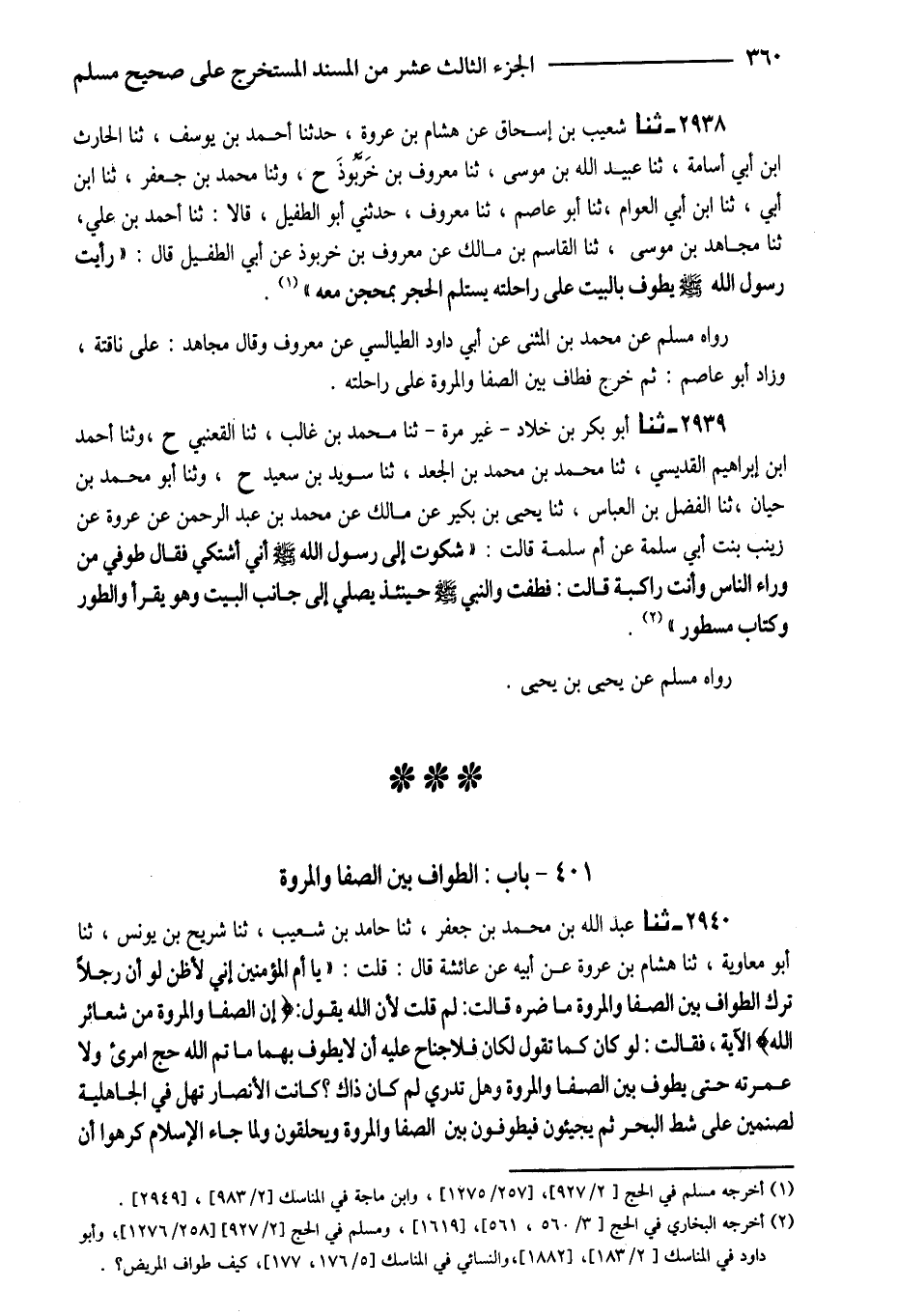 2938 - ثَنَا شُعَيْبُ بْنُ إِسْحَاقَ عَنْ هِشَامِ بن عُرْوَة حَدَّثَنَا أَحْمَدُ بْنُ يُوسُفَ ثَنَا الْحَارِث ابْن أَبِي أُسَامَةَ ثَنَا عُبَيْدُ اللَّهِ بْنُ مُوسَى ثَنَا مَعْرُوفُ بْنُ خَرَّبُوذَ ح وَثنا مُحَمَّدُ بْنُ جَعْفَر ثَنَا ابْن أبي ثَنَا ابْنُ أَبِي الْعَوَّامِ ثَنَا أَبُو عَاصِمٍ ثَنَا مَعْرُوفٌ حَدَّثَنِي أَبُو الطُّفَيْلِ قَالا ثَنَا أَحْمَدُ بْنُ عَلِيٍّ ثَنَا مُجَاهِدُ بْنُ مُوسَى ثَنَا الْقَاسِمُ بْنُ مَالِكٍ عَنْ مَعْرُوفِ بْنِ خَرَّبُوذَ عَنْ أَبِي الطُّفَيْلِ قَالَ رَأَيْتُ رَسُولَ اللَّهِ صَلَّى اللَّهُ عَلَيْهِ وَسَلَّمَ يَطُوفُ بِالْبَيْتِ عَلَى رَاحِلَتِهِ يَسْتَلِمُ الْحَجَرَ بِمِحْجَنٍ مَعَهُ