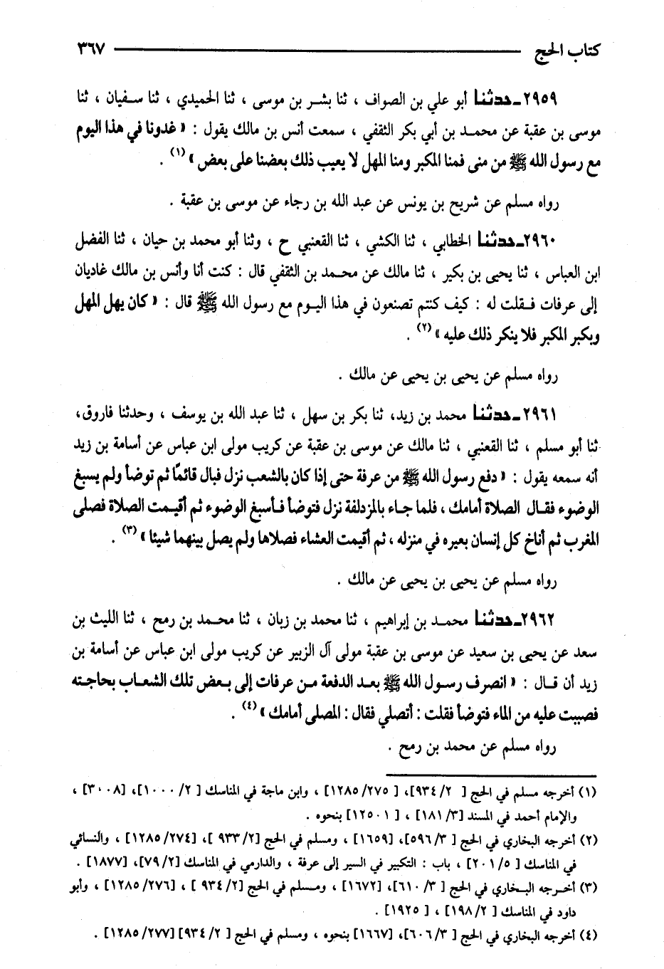 2961 - حَدَّثَنَا مُحَمَّدُ بْنُ زَيْدٍ ثَنَا بَكْرُ بْنُ سَهْلٍ ثَنَا عَبْدُ اللَّهِ بْنُ يُوسُفَ وَحَدَّثَنَا فَارُوقٌ ثَنَا أَبُو مُسلم ثَنَا العقنبي ثَنَا مَالِكٌ عَنْ مُوسَى بْنِ عُقْبَةَ عَنْ كُرَيْبٍ مَوْلَى ابْنِ عَبَّاسٍ عَنْ أُسَامَةَ بْنِ زَيْدٍ أَنَّهُ سَمِعَهُ يَقُولُ دَفَعَ رَسُولُ اللَّهِ صَلَّى اللَّهُ عَلَيْهِ وَسَلَّمَ مِنْ عَرَفَةَ حَتَّى إِذَا كَانَ بِالشِّعْبِ نَزَلَ فَبَالَ قَائِمًا ثُمَّ تَوَضَّأَ وَلَمْ يُسْبِغِ الْوُضُوءَ فَقَالَ الصَّلاةُ أَمَامَكَ فَلَمَّا جَاءَ بِالْمُزْدَلِفَةِ نَزَلَ فَتَوَضَّأَ فَأَسْبَغَ الْوُضُوءَ ثُمَّ أُقِيمَتِ الصَّلاةُ فَصَلَّى الْمَغْرِبَ ثُمَّ أَنَاخَ كُلُّ إِنْسَانٍ بَعِيرَهُ فِي مَنْزِلِهِ ثُمَّ أُقِيمَتِ الْعِشَاءُ فَصَلَّاهَا وَلَمْ يُصَلِّ بَيْنَهُمَا شَيْئًا