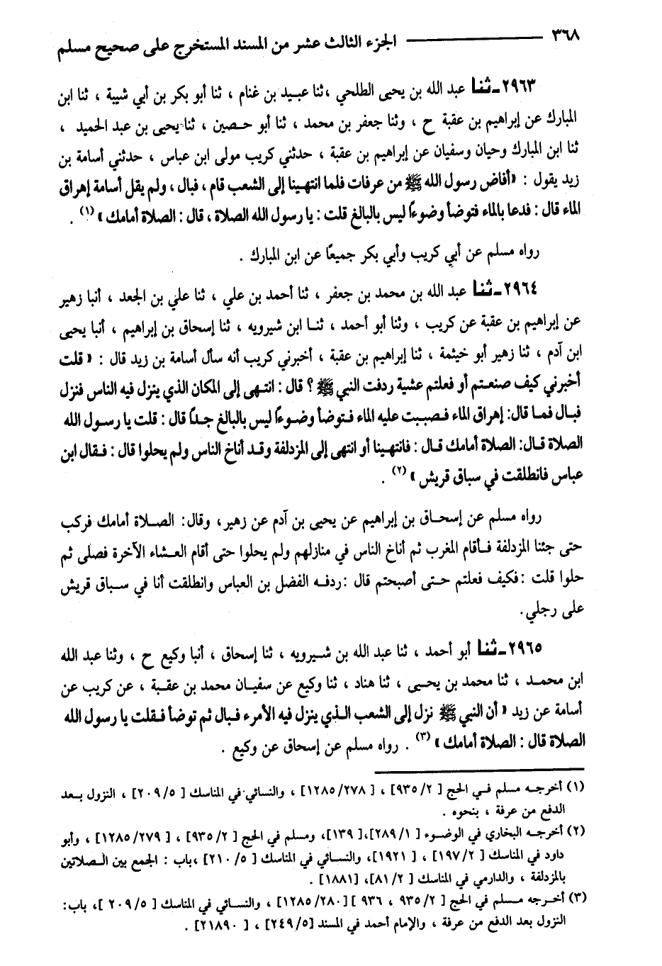 2963 - ثَنَا عَبْدُ اللَّهِ بْنُ يَحْيَى الطَّلْحِيُّ ثَنَا عُبَيْدُ بْنُ غَنَّامٍ ثَنَا أَبُو بَكْرِ بْنُ أَبِي شَيْبَةَ ثَنَا ابْنُ الْمُبَارَكِ عَنْ إِبْرَاهِيمَ بْنِ عُقْبَةَ ح وَثنا جَعْفَرُ بْنُ مُحَمَّدٍ ثَنَا أَبُو حُصَيْنٍ ثَنَا يَحْيَى بْنُ عَبْدِ الْحَمِيدِ ثَنَا ابْنُ الْمُبَارَكِ وَحَيَّانُ وَسُفْيَانُ عَنْ إِبْرَاهِيمَ بْنِ عُقْبَةَ حَدَّثَنِي كُرَيْبٌ مَوْلَى ابْنِ عَبَّاسٍ حَدَّثَنِي أُسَامَةُ بْنُ زَيْدٍ يَقُولُ أَفَاضَ رَسُولُ اللَّهِ صَلَّى اللَّهُ عَلَيْهِ وَسَلَّمَ مِنْ عَرَفَاتٍ فَلَمَّا انْتَهَيْنَا إِلَى الشِّعْبِ قَامَ فَبَالَ وَلَمْ يَقُلْ أُسَامَةُ أَهْرَاقَ الْمَاءَ قَالَ فَدَعَا بِالْمَاءِ فَتَوَضَّأَ وُضُوءًا لَيْسَ بِالْبَالِغِ قُلْتُ يَا رَسُولَ اللَّهِ الصَّلاةَ قَالَ الصَّلاةُ أَمَامَكَ