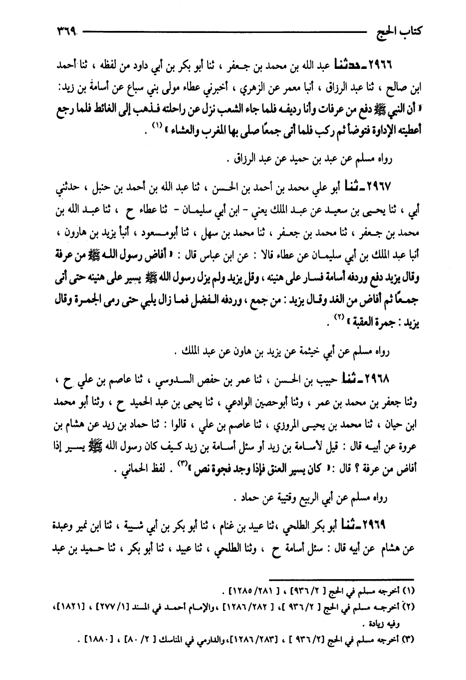 2968 - ثَنَا حَبِيبُ بْنُ الْحَسَنِ ثَنَا عُمَرُ بْنُ حَفْصٍ السَّدُوسِيُّ ثَنَا عَاصِمُ بْنُ عَلِيٍّ ح وَثنا جَعْفَرُ بْنُ مُحَمَّدِ بْنِ عُمَرَ وَثَنَا أَبُو حُصَيْنٍ الْوَادِعِيُّ ثَنَا يَحْيَى بْنُ عَبْدِ الْحَمِيدِ ح وثنا أَبُو مُحَمَّد ابْنُ حَيَّانَ ثَنَا مُحَمَّدُ بْنُ يَحْيَى الْمَرْوَزِيُّ ثَنَا عَاصِمُ بْنُ عَلِيٍّ قَالُوا ثَنَا حَمَّادُ بْنُ زَيْدٍ عَنْ هِشَامِ بْنِ عُرْوَةَ عَنْ أَبِيهِ قَالَ قِيلَ لِأُسَامَةَ بْنِ زَيْدٍ أَوْ سُئِلَ أُسَامَةُ بْنُ زَيْدٍ كَيْفَ كَانَ رَسُولُ اللَّهِ صَلَّى اللَّهُ عَلَيْهِ وَسَلَّمَ يَسِيرُ إِذَا أَفَاضَ مِنْ عَرَفَةَ قَالَ كَانَ يَسِيرُ الْعَنَقَ فَإِذَا وَجَدَ فَجْوَةً نَصَّ لَفْظِ الْحِمَّانِيِّ
