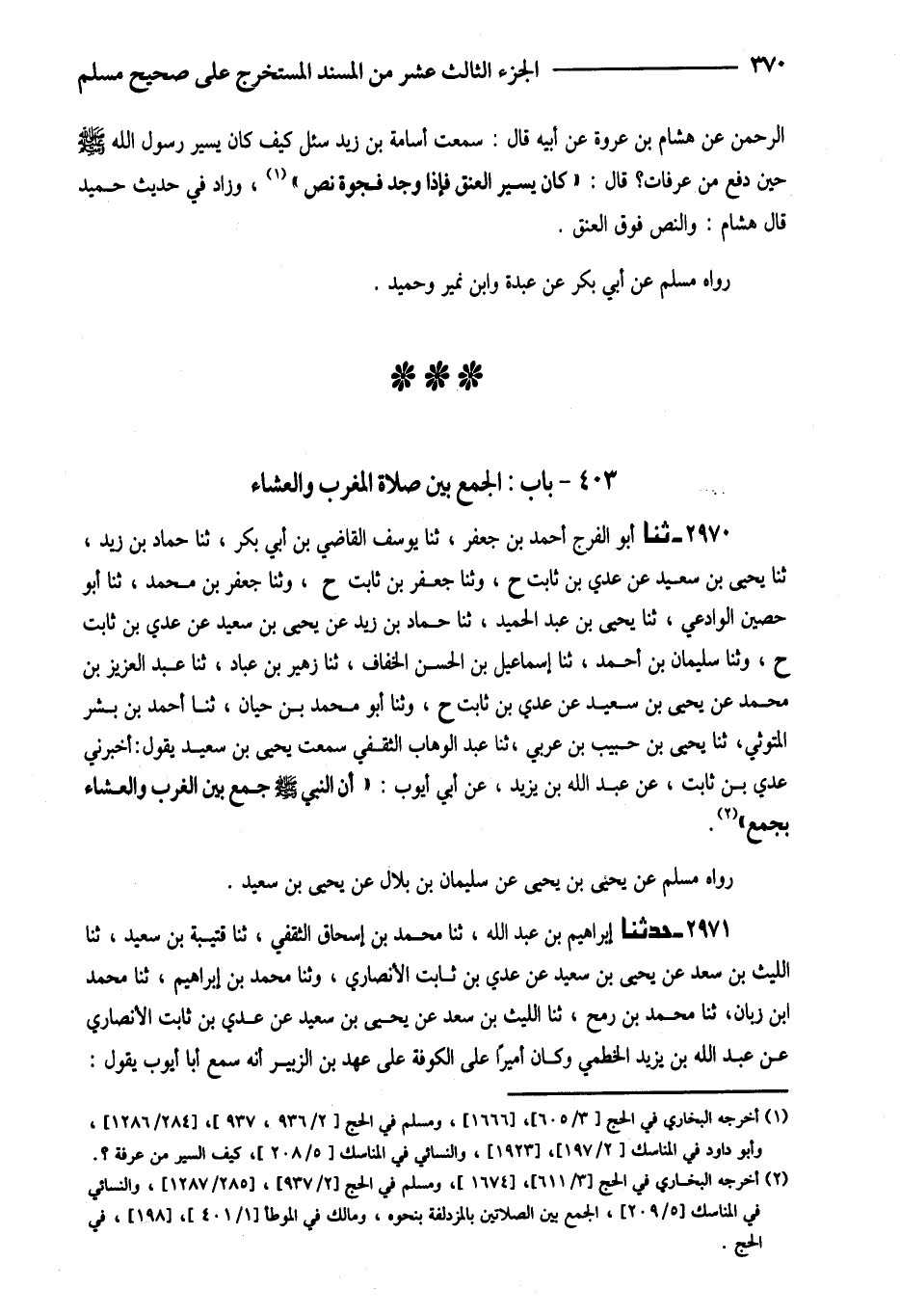 2970 - ثَنَا أَبُو الْفَرَجِ أَحْمَدُ بْنُ جَعْفَرٍ ثَنَا يُوسُف القَاضِي بْنُ أَبِي بَكْرٍ ثَنَا حَمَّادُ بْنُ زَيْدٍ ثَنَا يَحْيَى بْنُ سَعِيدٍ عَنْ عَدِيِّ بْنِ ثَابِتٍ ح وثنا جَعْفَر بْنِ ثَابِتٍ ح وَثنا جَعْفَرُ بْنُ مُحَمَّدٍ ثَنَا أَبُو حُصَيْنٍ الْوَادِعِيُّ ثَنَا يَحْيَى بْنُ عَبْدِ الْحَمِيدِ ثَنَا حَمَّادُ بْنُ زَيْدٍ عَنْ يَحْيَى بْنِ سَعِيدٍ عَنْ عَدِيِّ بْنِ ثَابِتٍ ح وَثَنَا سُلَيْمَانُ بْنُ أَحْمَدَ ثَنَا إِسْمَاعِيلُ بْنُ الْحَسَنِ الْخَفَّافُ ثَنَا زُهَيْرُ بْنُ عَبَّادٍ ثَنَا عَبْدُ الْعَزِيزِ بْنُ مُحَمَّدٍ عَنْ يَحْيَى بْنِ سَعِيدٍ عَنْ عَدِيِّ بْنِ ثَابِتٍ ح وَثَنَا أَبُو مُحَمَّدِ بْنُ حَيَّانَ ثَنَا أَحْمَدُ بْنُ بِشْرٍ الْمَتُّوثِيُّ ثَنَا يَحْيَى بْنُ حَبِيبِ بْنِ عَرَبِيٍّ ثَنَا عَبْدُ الْوَهَّابِ الثَّقَفِيُّ سَمِعْتُ يَحْيَى بْنَ سَعِيدٍ يَقُولُ أَخْبَرَنِي عَدِيُّ بْنُ ثَابِتٍ عَنْ عَبْدِ اللَّهِ بْنِ يَزِيدَ عَنْ أَبِي أَيُّوبَ أَنّ النَّبِيَّ صَلَّى اللَّهُ عَلَيْهِ وَسَلَّمَ جَمَعَ بَيْنَ الْمَغْرِبِ وَالْعِشَاءِ بِجَمْعٍ