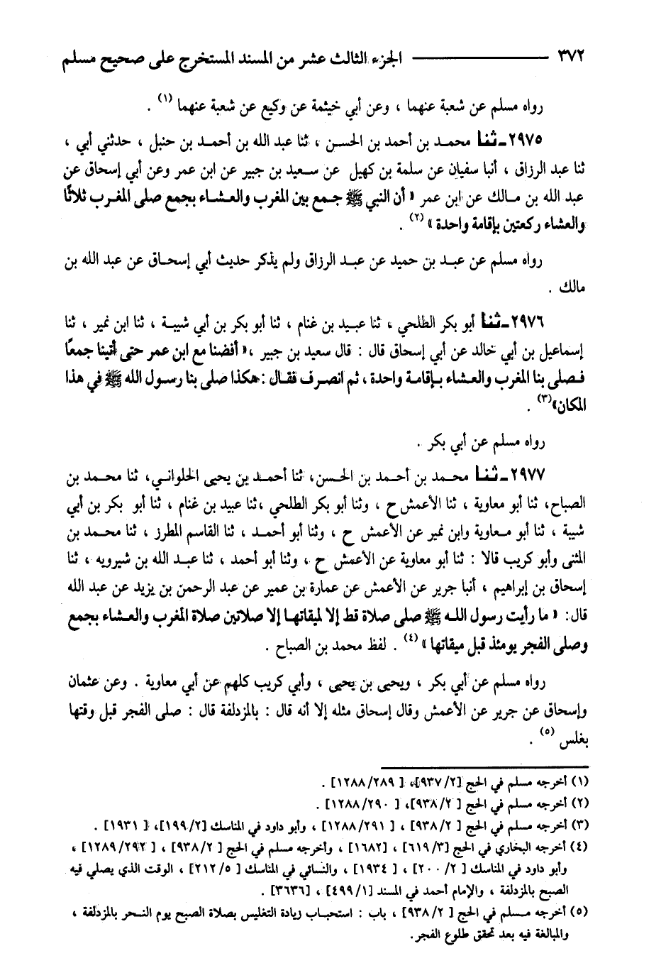 2976 - ثَنَا أَبُو بَكْرٍ الطَّلْحِيُّ ثَنَا عُبَيْدُ بْنُ غَنَّامٍ ثَنَا أَبُو بَكْرِ بْنُ أَبِي شَيْبَةَ ثَنَا ابْنُ نُمَيْرٍ ثَنَا إِسْمَاعِيلُ بْنُ أَبِي خَالِدٍ عَنْ أَبِي إِسْحَاقَ قَالَ قَالَ سَعِيدُ بْنُ جُبَيْرٍ أَفَضْنَا مَعَ ابْنِ عُمَرَ حَتَّى أَتَيْنَا جَمْعًا فَصَلَّى بِنَا الْمَغْرِبَ وَالْعِشَاءَ بِإِقَامَةٍ وَاحِدَةٍ ثُمَّ انْصَرَفَ فَقَالَ هَكَذَا صَلَّى بِنَا رَسُولُ اللَّهِ صَلَّى اللَّهُ عَلَيْهِ وَسَلَّمَ فِي هَذَا الْمَكَانِ