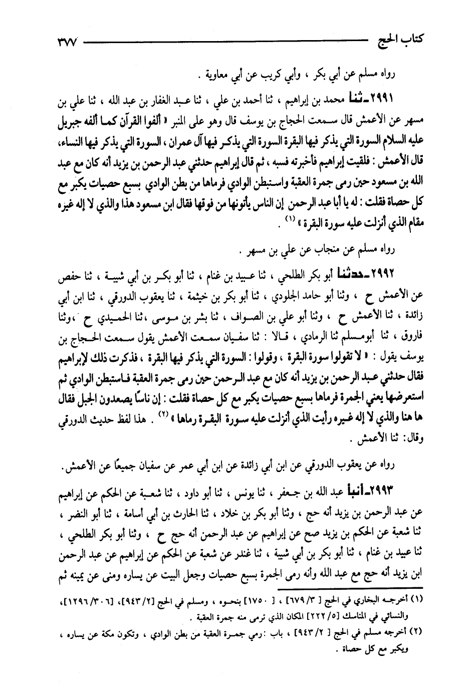 2992 - حَدَّثَنَا أَبُو بَكْرٍ الطَّلْحِيُّ ثَنَا عُبَيْدُ بْنُ غَنَّامٍ ثَنَا أَبُو بَكْرِ بْنُ أَبِي شَيْبَةَ ثَنَا حَفْصٌ عَنِ الأَعْمَشِ ح وَثنا أَبُو حَامِدٍ الْجُلُودِيُّ ثَنَا أَبُو بَكْرِ بْنُ خَيْثَمَةَ ثَنَا يَعْقُوبُ الدَّوْرَقِيُّ ثَنَا ابْنُ أَبِي زَائِدَةَ ثَنَا الأَعْمَشُ ح وثنا أَبُو عَلِيِّ بْنُ الصَّوَّافِ ثَنَا بِشْرُ بْنُ مُوسَى ثَنَا الْحُمَيْدِيُّ ح وثنا فَارُوقٌ ثَنَا أَبُو مُسْلِمٍ ثَنَا الرَّمَادِيُّ قَالا ثَنَا سُفْيَانُ سَمِعْتُ الأَعْمَشَ يَقُولُ سَمِعْتُ الْحَجَّاجَ بْنَ يُوسُفَ يَقُولُ لَا تَقُولُوا سُورَةَ الْبَقَرَةِ وَقُولُوا السُّورَةُ الَّتِي يُذْكَرُ فِيهَا الْبَقَرَةُ فَذَكَرْتُ ذَلِكَ لِإِبْرَاهِيمَ فَقَالَ حَدَّثَنِي عَبْدُ الرَّحْمَنِ بْنُ يَزِيدَ أَنَّهُ كَانَ مَعَ عَبْدِ الرَّحْمَنِ حِينَ رَمَى جَمْرَةَ الْعَقَبَةِ فَاسْتَبْطَنَ الْوَادِيَ ثُمَّ اسْتَعْرَضَهَا يَعْنِي الْجَمْرَةَ فَرَمَاهَا بِسَبْعِ حَصَيَاتٍ يُكَبِّرُ مَعَ كُلِّ حَصَاةٍ فَقُلْتُ إِنَّ نَاسًا يَصْعَدُونَ الْجَبَلَ فَقَالَ هَا هُنَا وَالَّذِي لَا إِلَهَ غَيْرُهُ رَأَيْتُ الَّذِي أُنْزِلَتْ عَلَيْهِ سُورَةُ الْبَقَرَةُ رَمَاهَا