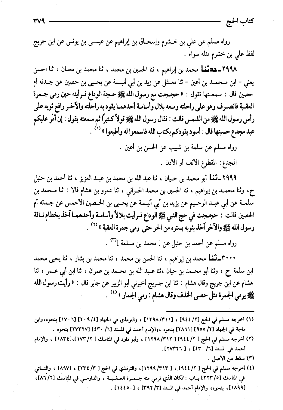 2999 - ثَنَا أَبُو مُحَمَّدِ بْنِ حَيَّانَ ثَنَا عَبْدُ اللَّهِ بْنُ مُحَمَّدِ بْنِ عَبْدِ الْعَزِيزِ ثَنَا أَحْمد بن حَنْبَل عَن ح ئوثنا مُحَمَّدُ بْنُ إِبْرَاهِيمَ ثَنَا الْحُسَيْنُ بْنُ مُحَمَّدٍ الْحَرَّانِيُّ ثَنَا عَمْرُو بْنُ هِشَامٍ قَالا ثَنَا مُحَمَّدُ بْنُ سَلَمَةَ عَنْ أَبِي عَبْدِ الرَّحِيمِ عَنْ يَزِيدَ بْنِ أَبِي أُنَيْسَةَ عَنْ يَحْيَى بْنِ الْحُصَيْنِ الأَحْمَسِ عَنْ جَدَّتِهِ أُمِّ الْحُصَيْنِ قَالَتْ حَجَجْتُ فِي حَجِّ النَّبِيِّ صَلَّى اللَّهُ عَلَيْهِ وَسَلَّمَ الْوَدَاعَ فَرَأَيْتُ بِلالًا وَأُسَامَةَ وَأَحَدُهُمَا آخِذٌ بِخِطَامِ نَاقَةِ رَسُولِ اللَّهِ صَلَّى اللَّهُ عَلَيْهِ وَسَلَّمَ وَالْآخَرُ آخِذٌ بِثَوْبِهِ يَسْتُرُهُ مِنَ الْحَرِّ حَتَّى رَمَى جَمْرَةَ الْعَقَبَةِ