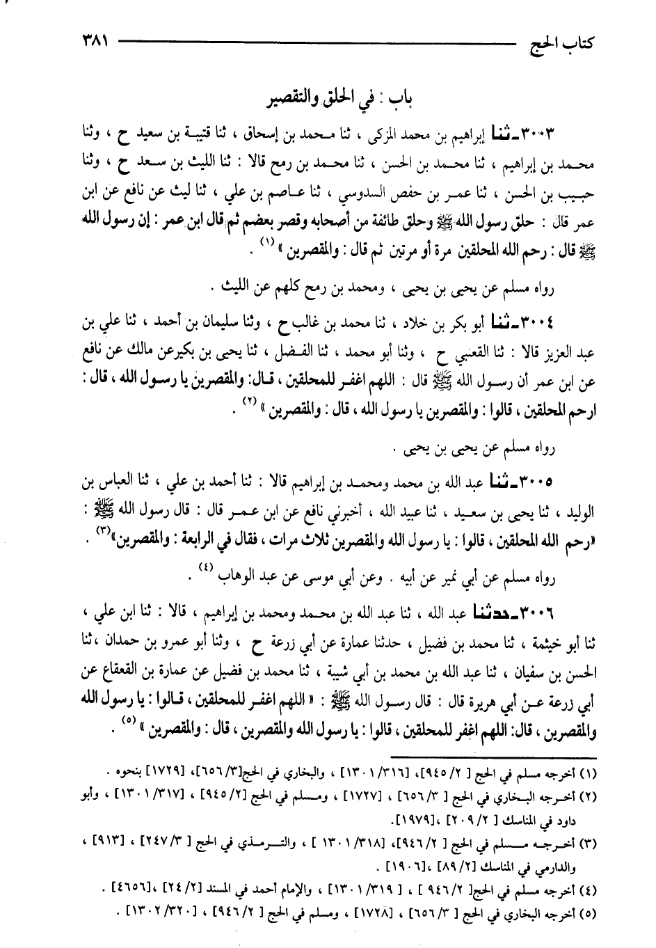 3003 - ثَنَا إِبْرَاهِيمُ بْنُ مُحَمَّدٍ الْمُزَكِّيُّ ثَنَا مُحَمَّدُ بْنُ إِسْحَاقَ ثَنَا قُتَيْبَةُ ابْن سَعِيدٌ ح وَثَنَا مُحَمَّدُ بْنُ إِبْرَاهِيمَ ثَنَا مُحَمَّدُ بْنُ الْحَسَنِ ثَنَا مُحَمَّدُ بْنُ رُمْحٍ قَالا ثَنَا اللَّيْثُ بْنُ سَعْدٍ ح وَثَنَا حَبِيبُ بْنُ الْحَسَنِ ثَنَا عُمَرُ بْنُ حَفْصٍ السَّدُوسِيُّ ثَنَا عَاصِمُ بْنُ عَلِيٍّ ثَنَا لَيْثُ عَنْ نَافِعٍ عَنِ ابْنِ عُمَرَ قَالَ حَلَقَ رَسُولُ اللَّهِ صَلَّى اللَّهُ عَلَيْهِ وَسَلَّمَ وَحَلَقَ طَائِفَةٌ مِنْ أَصْحَابِهِ وَقَصَّرَ بَعْضُهُمْ ثُمَّ قَالَ ابْنُ عُمَرَ إِنَّ رَسُولَ اللَّهِ صَلَّى اللَّهُ عَلَيْهِ وَسَلَّمَ قَالَ رَحِمَ اللَّهُ الْمُحَلِّقِينَ مَرَّةً أَوْ مَرَّتَيْنِ ثُمَّ قَالَ وَالْمُقَصِّرِينَ