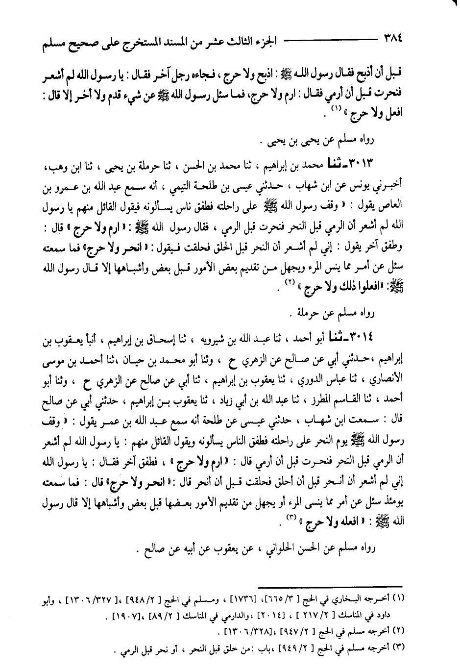 3013 - ثَنَا مُحَمَّدُ بْنُ إِبْرَاهِيمَ ثَنَا مُحَمَّدُ بْنُ الْحَسَنِ ثَنَا حَرْمَلَةُ بْنُ يَحْيَى ثَنَا ابْنُ وَهْبٍ أَخْبَرَنِي يُونُسَ عَنِ ابْنِ شِهَابٍ حَدَّثَنِي عِيسَى بْنُ طَلْحَةَ التَّيْمِيُّ أَنَّهُ سَمِعَ عَبْدَ اللَّهِ بْنَ عَمْرٍو بْنِ الْعَاصِ يَقُولُ وَقَفَ رَسُولُ اللَّهِ صَلَّى اللَّهُ عَلَيْهِ وَسَلَّمَ عَلَى رَاحِلَتِهِ فَطَفِقَ نَاسٌ يَسْأَلُونَهُ فَيَقُولُ الْقَائِلُ مِنْهُمْ يَا رَسُولَ اللَّهِ لَمْ أَشْعُرْ أَنَّ الرَّمْيَ قَبْلَ النَّحْرِ فَنَحَرْتُ قَبْلَ الرَّمْيِ فَقَالَ رَسُولُ اللَّهِ صَلَّى اللَّهُ عَلَيْهِ وَسَلَّمَ ارْمِ وَلا حَرَجَ قَالَ وَطَفِقَ آخَرُ يَقُولُ إِنِّي لَمْ أَشْعُرْ أَنَّ النَّحْرَ قَبْلَ أحلق فَحَلَقْتُ فَيَقُولُ انْحَرْ وَلا حَرَجَ قَالَ فَمَا سَمِعْتُهُ يَوْمَئِذٍ سُئِلَ عَنْ أَمْرٍ مِمَّا يَنْسَى الْمَرْءُ أَو يجهل من تَقْدِيم الْأُمُورِ قَبْلَ بَعْضٍ وَأَشْبَاهِهَا إِلَّا قَالَ رَسُولُ اللَّهِ صَلَّى اللَّهُ عَلَيْهِ وَسَلَّمَ افْعَلُوا ذَلِكَ وَلا حَرَجَ