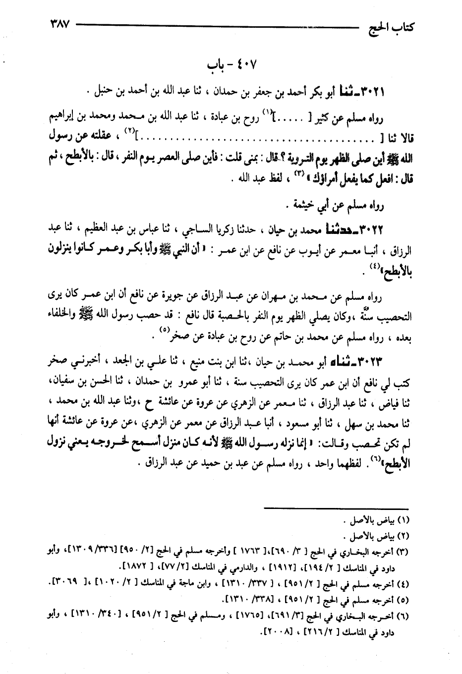 3023 - ثناه أَبُو مُحَمَّدِ بْنُ حَيَّانَ ثَنَا ابْنُ بِنْتِ مَنِيعٍ ثَنَا عَلِيُّ بْنُ الْجَعْدِ أَخْبَرَنِي صَخْرٌ كَتَبَ لِي نَافِع أَنَّ ابْنَ عُمَرَ كَانَ يَرَى التَّحْصِيبَ سُنَّةً ثَنَا أَبُو عَمْرِو بْنُ حَمْدَانَ ثَنَا الْحَسَنُ بْنُ سُفْيَانَ ثَنَا فَيَّاضٌ ثَنَا عَبْدُ الرَّزَّاقِ ثَنَا مَعْمَرٌ عَنِ الزُّهْرِيِّ عَنْ عُرْوَةَ عَنْ عَائِشَةَ ح وَثنا عَبْدُ اللَّهِ بْنُ مُحَمَّدٍ ثَنَا مُحَمَّدُ بْنُ سَهْلٍ ثَنَا أَبُو مَسْعُودٍ أنبا عَبْدُ الرَّزَّاقِ عَنْ مَعْمَرٌ عَنِ الزُّهْرِيِّ عَنْ عُرْوَةَ عَنْ عَائِشَةَ أَنَّهَا لَمْ تَكُنْ تُحَصِّبُ وَقَالَتْ إِنَّمَا نَزَلَهُ رَسُولُ اللَّهِ صَلَّى اللَّهُ عَلَيْهِ وَسَلَّمَ لِأَنَّهُ كَانَ منزل أَسْمَحُ لِخُرُوجِهِ يَعْنِي نُزُولَ الأَبْطَحِ لَفْظُهُمَا وَاحِدٌ رَوَاهُ مُسْلِمٌ عَنْ عَبْدِ بْنِ حُمَيْدٍ عَنْ عَبْدِ الرَّزَّاقِ