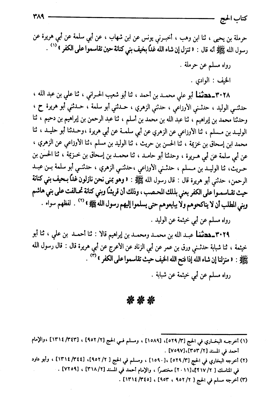 3028 - حَدَّثَنَا أَبُو عَلِيٍّ مُحَمَّدُ بْنُ أَحْمَدَ ثَنَا أَبُو شُعَيْبٍ الْحَرَّانِيُّ ثَنَا عَلِيُّ بْنُ عَبْدِ اللَّهِ حَدَّثَنِي الْوَلِيدِ حَدَّثَنِي الأَوْزَاعِيُّ حَدَّثَنِي الزُّهْرِيُّ حَدَّثَنِي أَبُو سَلَمَةَ حَدَّثَنِي أَبُو هُرَيْرَةَ ح وَحَدَّثَنَا مُحَمَّدُ بْنُ إِبْرَاهِيمَ ثَنَا عَبْدُ اللَّهِ بْنُ مُحَمَّدِ بْنِ أَسْلَمَ ثَنَا عَبْدُ الرَّحْمَن بن إِبْرَاهِيم بن دُحَيْمٌ ثَنَا الْوَلِيدُ بْنُ مُسْلِمٍ ثَنَا الأَوْزَاعِيُّ عَنِ الزُّهْرِيِّ عَنْ أَبِي سَلَمَةَ عَنْ أَبِي هُرَيْرَةَ وَحَدَّثَنَا أَبُو حُمَيْدٍ ثَنَا مُحَمَّدُ بْنُ إِسْحَاقَ بْنِ خُزَيْمَةَ ثَنَا الْحَسَنُ بْنُ حُرَيْثٍ ثَنَا الْوَلِيدُ بْنُ مُسْلِمٍ ثَنَا الأَوْزَاعِيُّ عَنِ الزُّهْرِيِّ عَنْ أَبِي سَلَمَةَ عَنْ أَبِي هُرَيْرَةَ وَحَدَّثَنَا أَبُو حَامِدٍ ثَنَا مُحَمَّدُ بْنُ إِسْحَاقَ بْنِ خُزَيْمَةَ ثَنَا الْحَسَنُ بْنُ حُرَيْثٍ ثَنَا الْوَلِيدُ بْنُ مُسْلِمٍ حَدَّثَنِي الأَوْزَاعِيِّ حَدَّثَنِي الزُّهْرِيُّ حَدَّثَنِي أَبُو سَلَمَةَ بْنُ عَبْدِ الرَّحْمَنِ حَدَّثَنِي أَبُو هُرَيْرَةَ قَالَ قَالَ رَسُولُ اللَّهِ صَلَّى اللَّهُ عَلَيْهِ وَسَلَّمَ وَهُوَ بِمِنًى نَحْنُ نَازِلُونَ غَدًا بِخَيْفِ بَنِي كِنَانَةَ حَيْثُ تَقَاسَمُوا عَلَى الْكُفْرِ يَعْنِي بِذَلِكَ الْمُحَصَّبَ وَذَلِكَ أَنَّ قُرَيْشًا وَبَنِي كِنَانَةَ تَحَالَفَتْ عَلَى بَنِي هَاشِمٍ وَبَنِي الْمُطَلَّبِ أَنْ لَا يُنَاكِحُوهُمْ وَلا يُبَايِعُوهُمْ حَتَّى يُسَلِّمُوا إِلَيْهِمْ رَسُولَ اللَّهِ صَلَّى اللَّهُ عَلَيْهِ وَسَلَّمَ