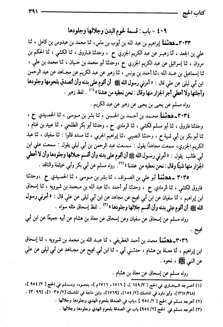 3034 - حَدثنَا مُحَمَّد بن أَحْمد ن الْحَسَنِ ثَنَا بِشْرُ بْنُ مُوسَى ثَنَا الْحُمَيْدِيُّ ح وَحَدَّثَنَا فَارُوقُ ثَنَا أَبُو مُسْلِمٍ الْكَشِّيُّ ثَنَا الرَّمَادِيُّ ح وَحَدَّثَنَا أَبُو بَكْرٍ الطَّلْحِيُّ ثَنَا عُبَيْدُ بْنُ غَنَّامٍ ثَنَا أَبُو بَكْرِ بْنُ أَبِي شَيْبَةَ ح وَحَدَّثَنَا النَّصِيبِيُّ ثَنَا إِبْرَاهِيمُ الْحَرْبِيُّ ثَنَا مُسَدَّدٌ قَالُوا ثَنَا سُفْيَانُ ثَنَا عَبْدُ الْكَرِيمِ الْجَزَرِيُّ سَمِعْتُ مُجَاهِدًا يَقُولُ سَمِعْتُ عَبْدِ الرَّحْمَنِ بْنِ أَبِي لَيْلَى يَقُول سَمِعت عَليّ ابْن أَبِي طَالِبٍ يَقُولُ أَمَرَنِي رَسُولُ اللَّهِ صَلَّى اللَّهُ عَلَيْهِ وَسَلَّمَ أَنْ أَقُومَ عَلَى بُدْنِهِ وَأَنْ أَقْسِمَ جِلالَهَا وَجُلُودَهَا وَأَنْ لَا أُعْطِيَ الْجَزَّارَ مِنْهَا شَيْئًا وَقَالَ نَحْنُ نُعْطِي مِنْ عِنْدِنَا