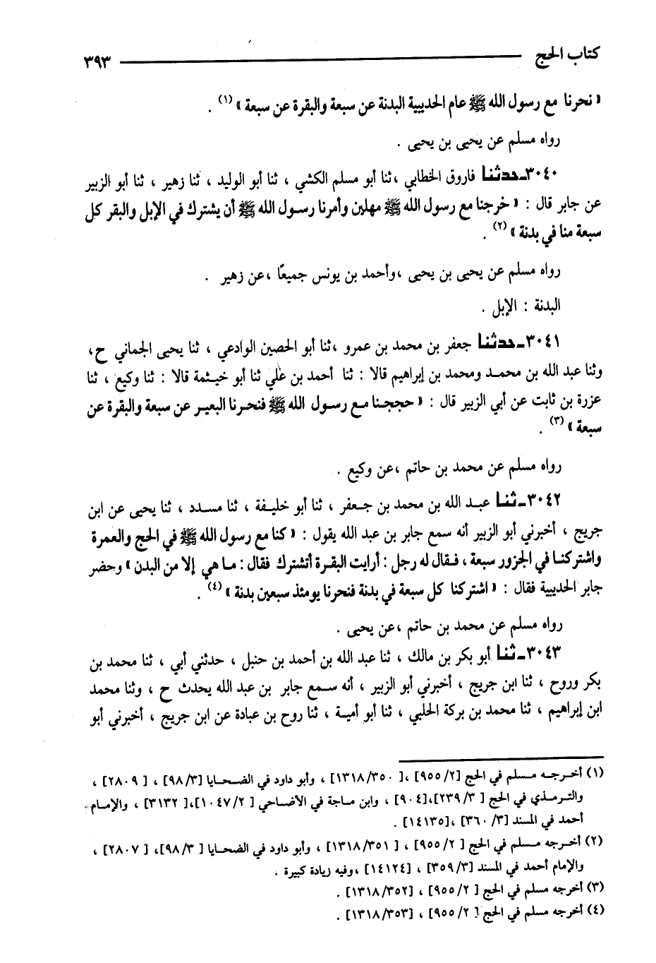 3040 - حَدَّثَنَا فَارُوقٌ الْخَطَّابِيُّ ثَنَا أَبُو مُسْلِمٍ الْكَشِّيُّ ثَنَا أَبُو الْوَلِيدِ ثَنَا زُهَيْرٌ ثَنَا أَبُو الزُّبَيْرِ عَنْ جَابِرٍ قَالَ خَرَجْنَا مَعَ رَسُولِ اللَّهِ صَلَّى اللَّهُ عَلَيْهِ وَسَلَّمَ مُهِلِّينَ وَأَمَرَنَا رَسُولُ اللَّهِ صَلَّى اللَّهُ عَلَيْهِ وَسَلَّمَ أَنْ يَشْتَرِكَ فِي الْإِبِلِ وَالْبَقَرِ كُلُّ سَبْعَةٍ مِنَّا فِي بَدَنَةٍ