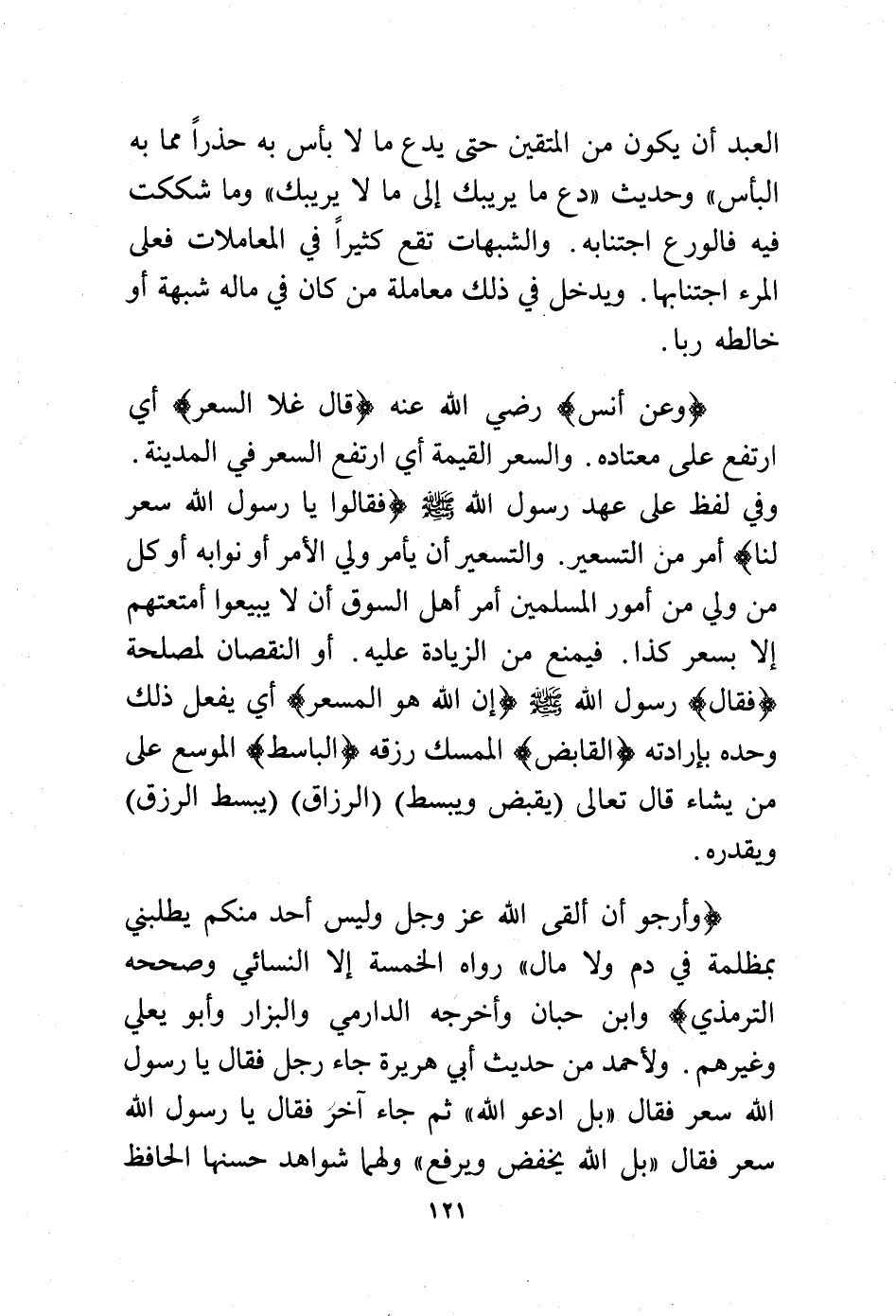 (وأرجو أن ألقى الله –عز وجل- وليس أحد منكم يطلبني بمظلمة في دم ولا مال" رواه الخمسة إلا النسائي وصححه الترمذي) وابن حبان وأخرجه الدارمي والبزار وأبو يعلى وغيرهم. ولأحمد من حديث أبي هريرة جاء رجل فقال يا رسول الله سعر فقال "بل ادعو الله" ثم جاء آخر فقال يا رسول الله سعر فقال "بل الله يخفض ويرفع" ولهما شواهد حسنها الحافظ