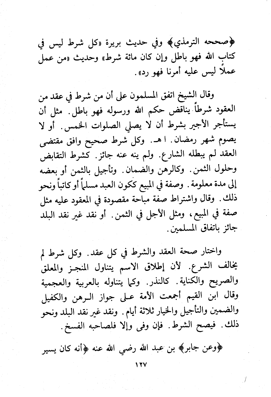 وقال الشيخ اتفق المسلمون على أن من شرط في عقد من العقود شرطًا يناقض حكم الله ورسوله فهو باطل. مثل أن يستأجر الأجير بشرط أن لا يصلي الصلوات الخمس. أو لا يصوم شهر رمضان. اهـ. وكل شرط صحيح وافق مقتضى العقد لم يبطله الشارع. ولم ينه عنه جائز. كشرط التقابض وحلول الثمن. وكالرهن والضمان. وتأجيل بالثمن أو بعضه إلى مدة معلومة. وصفة في المبيع ككون العبد مسلماً أو كتابيًّا ونحو ذلك. وقال واشتراك صفة مباحة مقصودة في المعقود عليه مثل صفة في المبيع, ومثل الأجل في الثمن. أو نقد غير نقد البلد جائز باتفاق المسلمين.