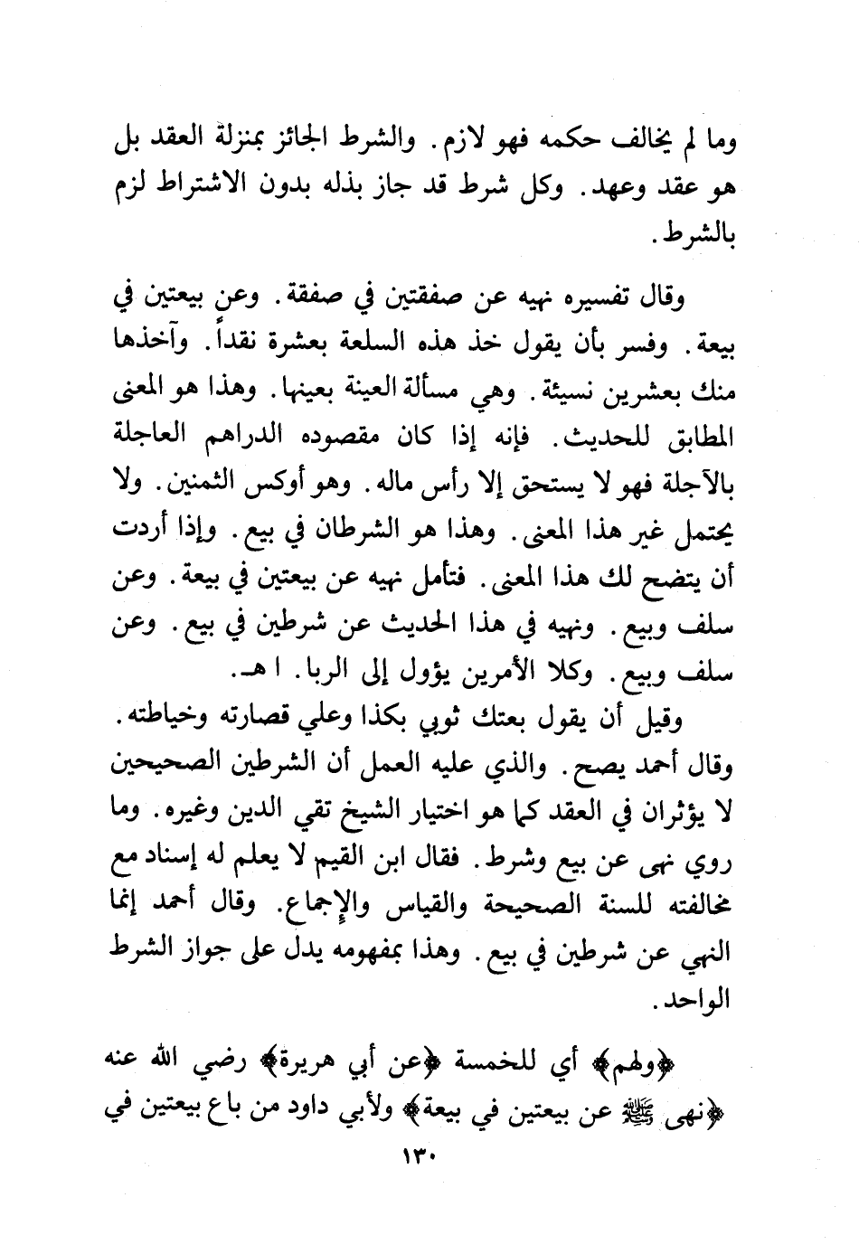 وقال تفسيره نهيه عن صفقتين في صفقة. وعن بيعتين في بيعة. وفسر بأن يقول خذ هذه السلعة بعشرة نقدًا. وآخذها منك بعشرين نسيئة. وهي مسألة العينة بعينها. وهذا هو المعنى المطابق للحديث. فإنه إذا كان مقصوده الدراهم العاجلة بالآجلة فهو لا يستحق إلا رأس ماله. وهو أوكس الثمنين. ولا يحتمل غير هذا المعنى. وهذا هو الشرطان في بيع. وإذا أردت أن يتضح لك هذا المعنى. فتأمل نهيه عن بيعتين في بيعة. وعن سلف وبيع. ونهيه في هذا الحديث عن شرطين في بيع. وعن سلف وبيع. وكلا الأمرين يؤول إلى الربا. اهـ.