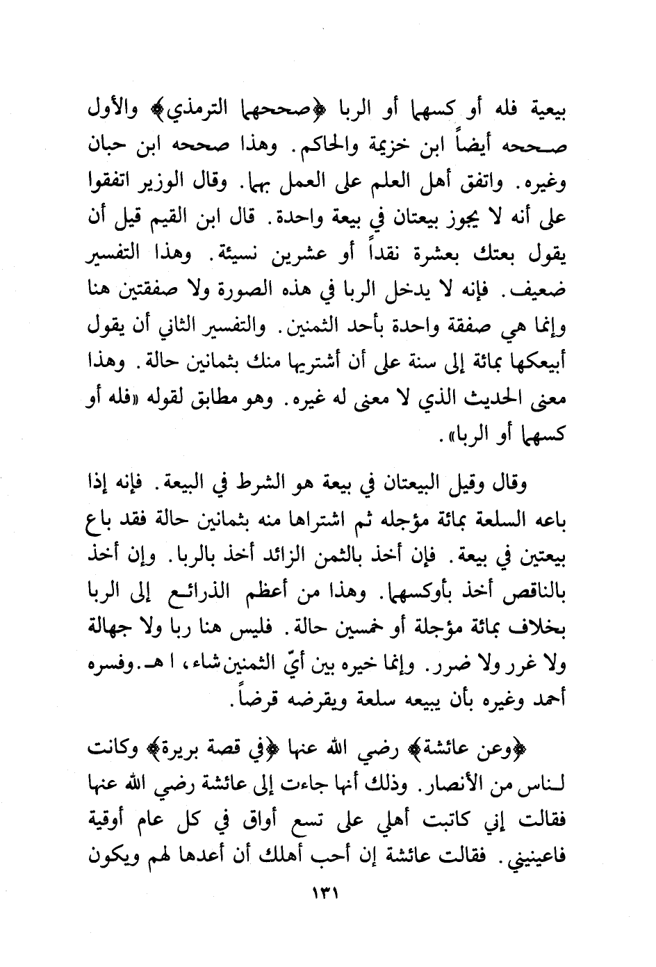 بيعية فله أوكسهما أو الربا (صححهما الترمذي) والأول صححه أيضًا ابن خزيمة والحاكم. وهذا صححه ابن حبان وغيره. واتفق أهل العلم على العمل بهما. وقال الوزير اتفقوا على أنه لا يجوز بيعتان في بيعة واحدة. قال ابن القيم قيل أن يقول بعتك بعشرة نقدًا أو عشرين نسيئة. وهذا التفسير ضعيف. فإنه لا يدخل الربا في هذه الصورة ولا صفقتين هنا وإنما هي صفقة واحدة بأحد الثمنين. والتفسير الثاني أن يقول أبيعكها بمائة إلى سنة على أن أشتريها منك بثمانين حالة. وهذا معنى الحديث الذي لا معنى له غيره. وهو مطابق لقوله "فله أوكسهما أو الربا".