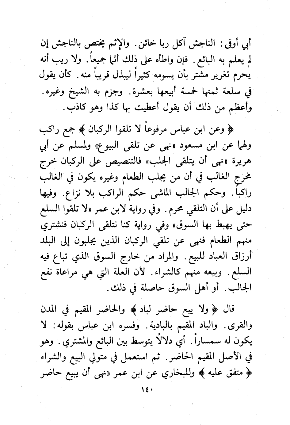 (وعن ابن عباس مرفوعًا لا تلقوا الركبان) جمع راكب ولهما عن ابن مسعود "نهى عن تلقي البيوع" ولمسلم عن أبي هريرة "نهى أن يتلقى الجلب" فالتنصيص على الركبان خرج مخرج الغالب في أن من يجلب الطعام وغيره يكون في الغالب راكبًا. وحكم الجالب الماشي حكم الراكب بلا نزاع. وفيها دليل على أن التلقي محرم. وفي رواية لابن عمر "لا تلقوا السلع حتى يهبط بها السوق" وفي رواية كنا نتلقى الركبان فنشتري منهم الطعام فنهى عن تلقي الركبان الذين يجلبون إلى البلد أرزاق العباد للبيع. والمراد من خارج السوق الذي تباع فيه السلع. وبيعه منهم كالشراء. لأن العلة التي هي مراعاة نفع الجالب. أو أهل السوق حاصلة في ذلك.