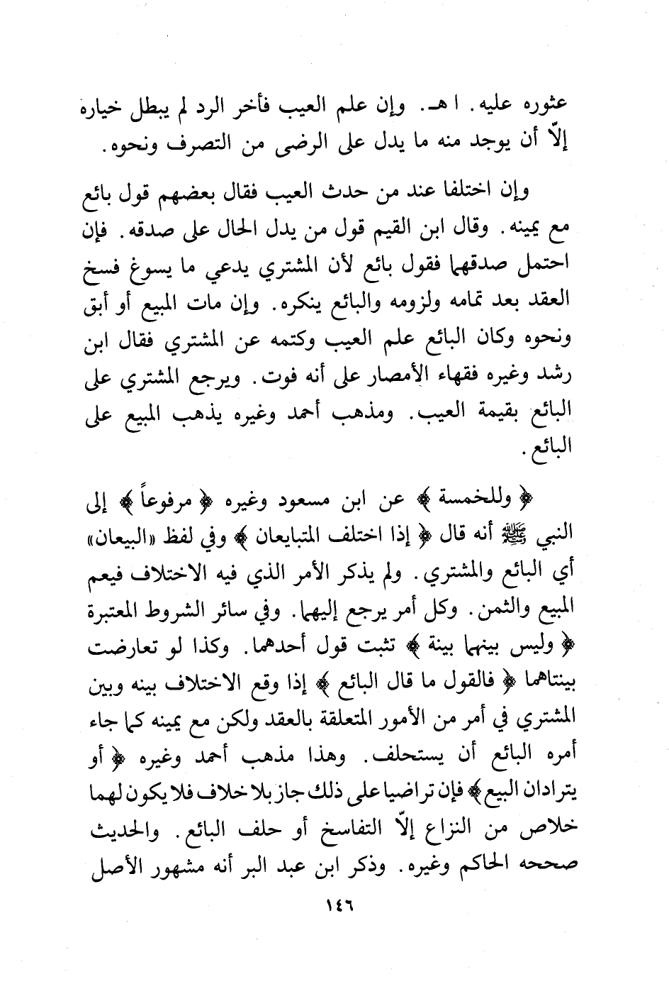 (وللخمسة) عن ابن مسعود وغيره (مرفوعًا) إلى النبي - صلى الله عليه وسلم - أنه قال (إذا اختلف المتبايعان) وفي لفظ "البيعان" أي البائع والمشتري. ولم يذكر الأمر الذي فيه الاختلاف فيعم المبيع والثمن. وكل أمر يرجع إليهما. وفي سائر الشروط المعتبرة (وليس بينهما بينة) تثبت قول أحدهما. وكذا لو تعارضت بينتاهما (فالقول ما قال البائع) إذا وقع الاختلاف بينه وبين المشتري في أمر من الأمور المتعلقة بالعقد ولكن مع يمينه كما جاء أمره البائع أن يستحلف. وهذا مذهب أحمد وغيره (أو يترادان البيع) فإن تراضيا على ذلك جاز بلا خلاف فلا يكون لهما خلاص من النزاع إلا التفاسخ أو حلف البائع. والحديث صححه الحاكم وغيره. وذكر ابن عبد البر. أنه مشهور الأصل