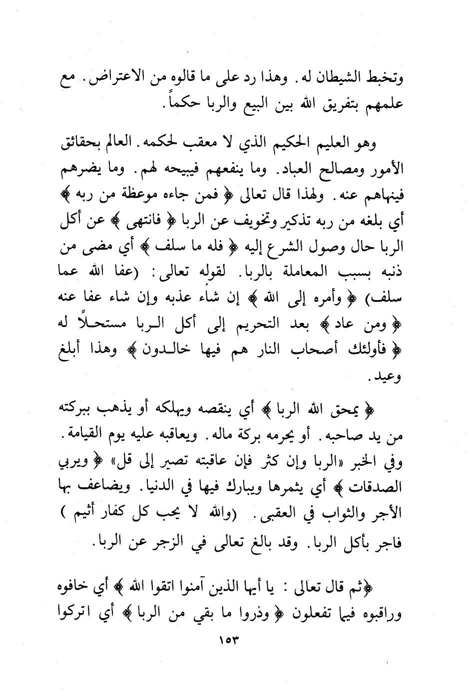وهو العليم الحكيم الذي لا معقب لحكمه. العالم بحقائق الأمور ومصالح العباد. وما ينفعهم فيبيحه لهم. وما يضرهم فينهاهم عنه. ولهذا قال تعالى: {فَمَن جَاءهُ مَوْعِظَةٌ مِّن رَّبِّهِ} أي بلغه من ربه تذكير وتخويف عن الربا {فَانتَهَىَ} عن أكل الربا حال وصول الشرع إليه {فَلَهُ مَا سَلَفَ} أي مضى من ذنبه بسبب المعاملة بالربا. لقوله تعالى: عفا الله عما سلف {وَأَمْرُهُ إِلَى اللهِ} إن شاء عذبه وإن شاء عفا عنه {وَمَنْ عَادَ} بعد التحريم إلى أكل الربا مستحلًا له {فَأُوْلَئِكَ أَصْحَابُ النَّارِ هُمْ فِيهَا خَالِدُون} وهذا أبلغ وعيد.