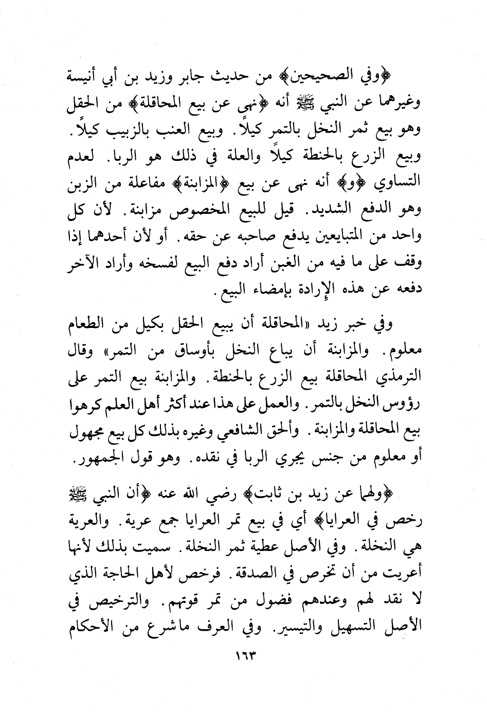 (ولهما عن زيد بن ثابت) -رضي الله عنه- (أن النبي - صلى الله عليه وسلم - رخص في العرايا) أي في بيع تمر العرايا جمع عرية. والعرية هي النخلة. وفي الأصل عطية ثمر النخلة. سميت بذلك لأنها أعريت من أن تخرص في الصدقة. فرخص لأهل الحاجة الذي لا نقد لهم وعندهم فضول من تمر قوتهم. والترخيص في الأصل