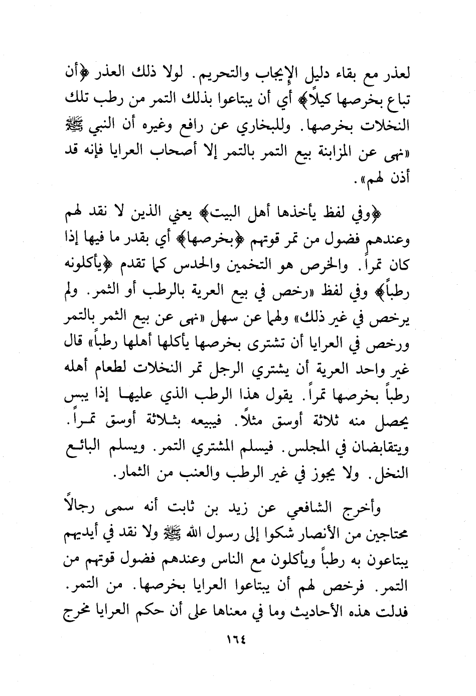 وأخرج الشافعي عن زيد بن ثابت أنه سمى رجالًا محتاجين من الأنصار شكوا إلى رسول الله - صلى الله عليه وسلم - ولا نقد في أيديهم يبتاعون به رطبًا ويأكلون مع الناس وعندهم فضول قوتهم من التمر. فرخص لهم أن يبتاعوا العرايا بخرصها. من التمر. فدلت هذه الأحاديث وما في معناها على أن حكم العرايا مخرج