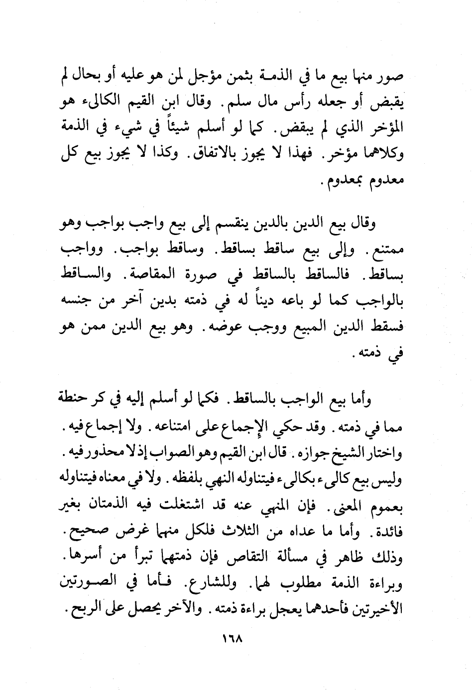 وأما بيع الواجب بالساقط. فكما لو أسلم إليه في كر حنطة مما في ذمته. وقد حكى الإجماع على امتناعه. ولا إجماع فيه. واختار الشيخ جوازه. قال ابن القيم وهو الصواب إذ لا محذور فيه. وليس بيع كالئ بكالئ فيتناوله النهي بلفظه. ولا في معناه فيتناوله بعموم المعنى. فإنه المنهي عنه قد اشتغلت فيه الذمتان بغير فائدة. وأما ما عداه من الثلاث فلكل منهما غرض صحيح. وذلك ظاهر في مسألة التقاص، فإن ذمتهما تبرأ من أسرها وبراءة الذمة مطلوب لهما. وللشارع. فأما في الصورتين الأخيرتين فأحدهما يعجل براءة ذمته. والآخر يحصل على الربح.