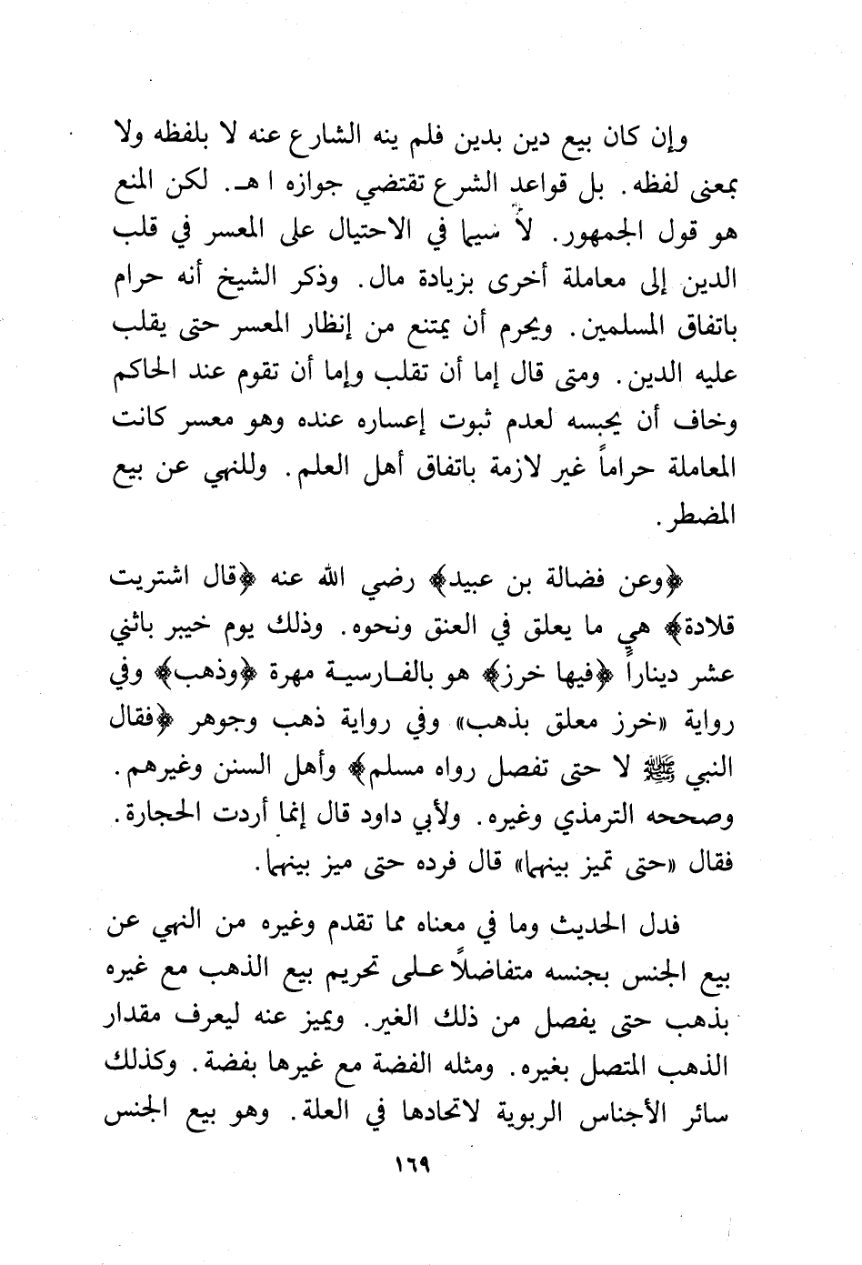 (وعن فضالة بن عبيد -رضي الله عنه- (قال اشتريت قلادة) وهي ما يعلق في العنق ونحوه. وذلك يوم خيبر باثني عشر دينارًا (فيها خرز) هو بالفارسية مهرة (وذهب) وفي رواية "خرز معلق بذهب" وفي رواية ذهب وجوهر (فقال النبي - صلى الله عليه وسلم - لا حتى تفصل رواه مسلم) وأهل السنن وغيرهم.