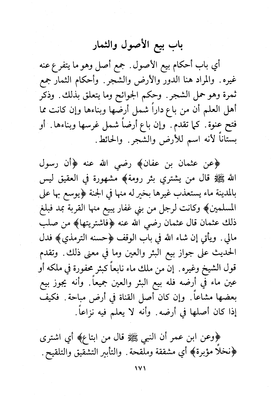 (وعن عثمان بن عفان) -رضي الله عنه- (أن رسول الله - صلى الله عليه وسلم - قال من يشتري بئر رومة) مشهورة في العقيق ليس بالمدينة ماء يستعذب غيرها بخير له منها في الجنة (يوسع بها على المسلمين) وكانت لرجل من بني غفار يبيع منها القربة بمد فبلغ ذلك عثمان قال عثمان -رضي الله عنه- (فاشتريتها) من صلب مالي. ويأتي إن شاء الله في باب الوقف (حسنه الترمذي) فدل الحديث على جواز بيع البئر والعين وما في معنى ذلك. وتقدم قول الشيخ وغيره. إن من ملك ماء نابعًا كبئر محفورة في ملكه أو عين ماء في أرضه فله بيع البئر والعين جميعًا. وأنه يجوز بيع بعضها مشاعًا. وإن كان أصل القناة في أرض مباحة. فكيف إذا كان أصلها في أرضه. وأنه لا يعلم فيه نزاعًا.