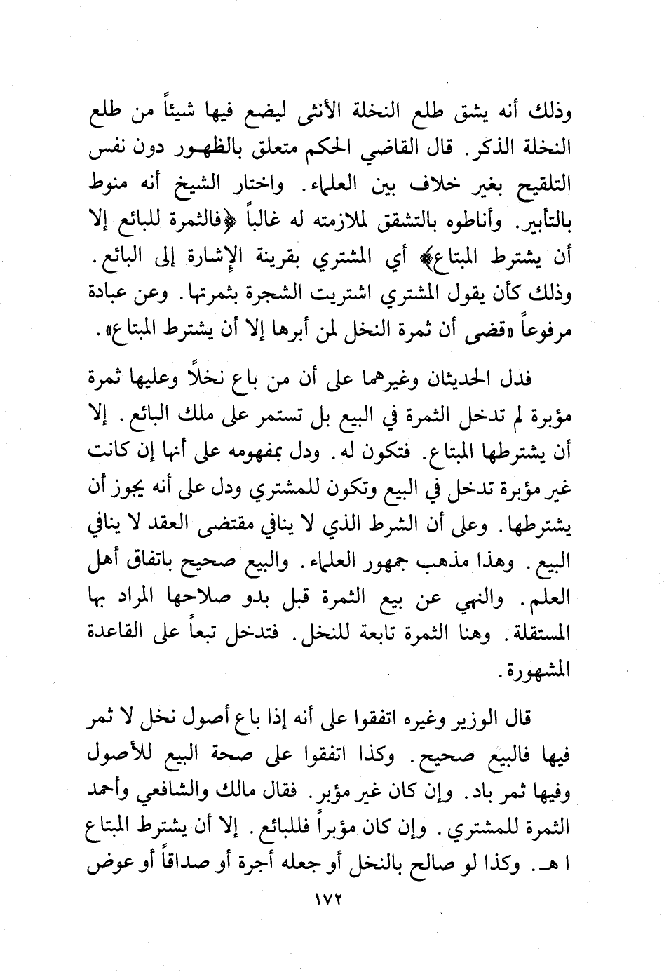 فدل الحديثان وغيرهما على أن من باع نخلًا وعليها ثمرة مؤبرة لم تدخل الثمرة في البيع بل تستمر على ملك البائع. إلا أن يشترطها المبتاع. فتكون له. ودل بمفهومه على أنها إن كانت غير مؤبرة تدخل في البيع وتكون للمشتري ودل على أنه يجوز أن يشترطها. وعلى أن الشرط الذي لا ينافي مقتضى العقد لا ينافي البيع. وهذا مذهب جمهور العلماء. والبيع صحيح باتفاق أهل العلم. والنهي عن بيع الثمرة قبل بدو صلاحها المراد بها المستقلة. وهنا الثمرة تابعة للنخل. فتدخل تبعًا على القاعدة المشهورة.