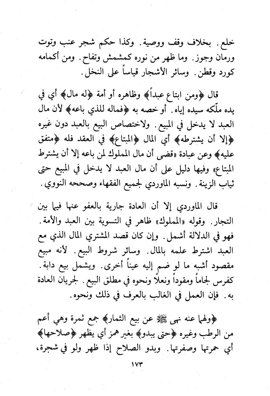 قال الماوردي إلا أن العادة جارية بالعفو عنها فيما بين التجار. وقوله "المملوك" ظاهر في التسوية بين العبد والأمة. فهو في الدلالة أشمل. وإن كان قصد المشتري المال الذي مع العبد اشترط علمه بالمال. وسائر شروط البيع. لأنه مبيع مقصود أشبه ما لو ضم إليه عينًا أخرى. ويشمل بيع دابة. كفرس لجامًا ومقودًا ونعلًا ونحوه في مطلق البيع. لجريان العادة به. فإن العمل في الغالب بالعرف في ذلك ونحوه.