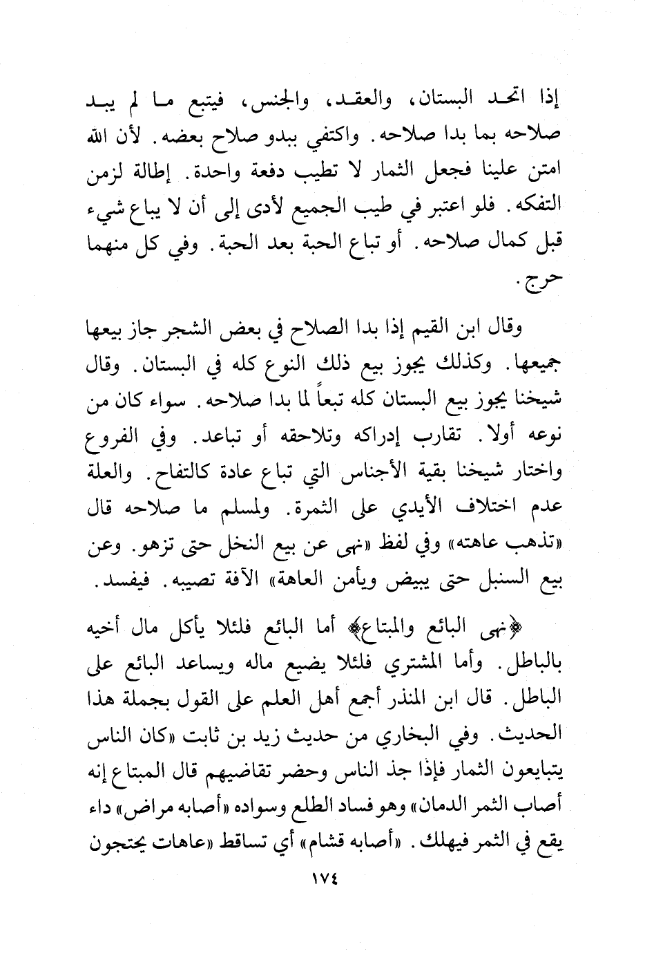 وقال ابن القيم إذا بدا الصلاح في بعض الشجرة جاز بيعها جميعها. وكذلك يجوز بيع ذلك النوع كله في البستان. وقال شيخنا يجوز بيع البستان كله تبعًا لما بدا صلاحه. سواء كان من نوعه أولًا تقارب إدراكه وتلاحقه أو تباعد. وفي الفروع واختار شيخنا بقية الأجناس التي تباع عادة كالتفاح. والعلة عدم اختلاف الأيدي على الثمرة. ولمسلم ما صلاحه قال "تذهب عاهته" وفي لفظ "نهى عن بيع النخل حتى تزهو. وعن بيع السنبل حتى يبيض ويأمن العاهة" الآفة تصيبه. فيفسد.