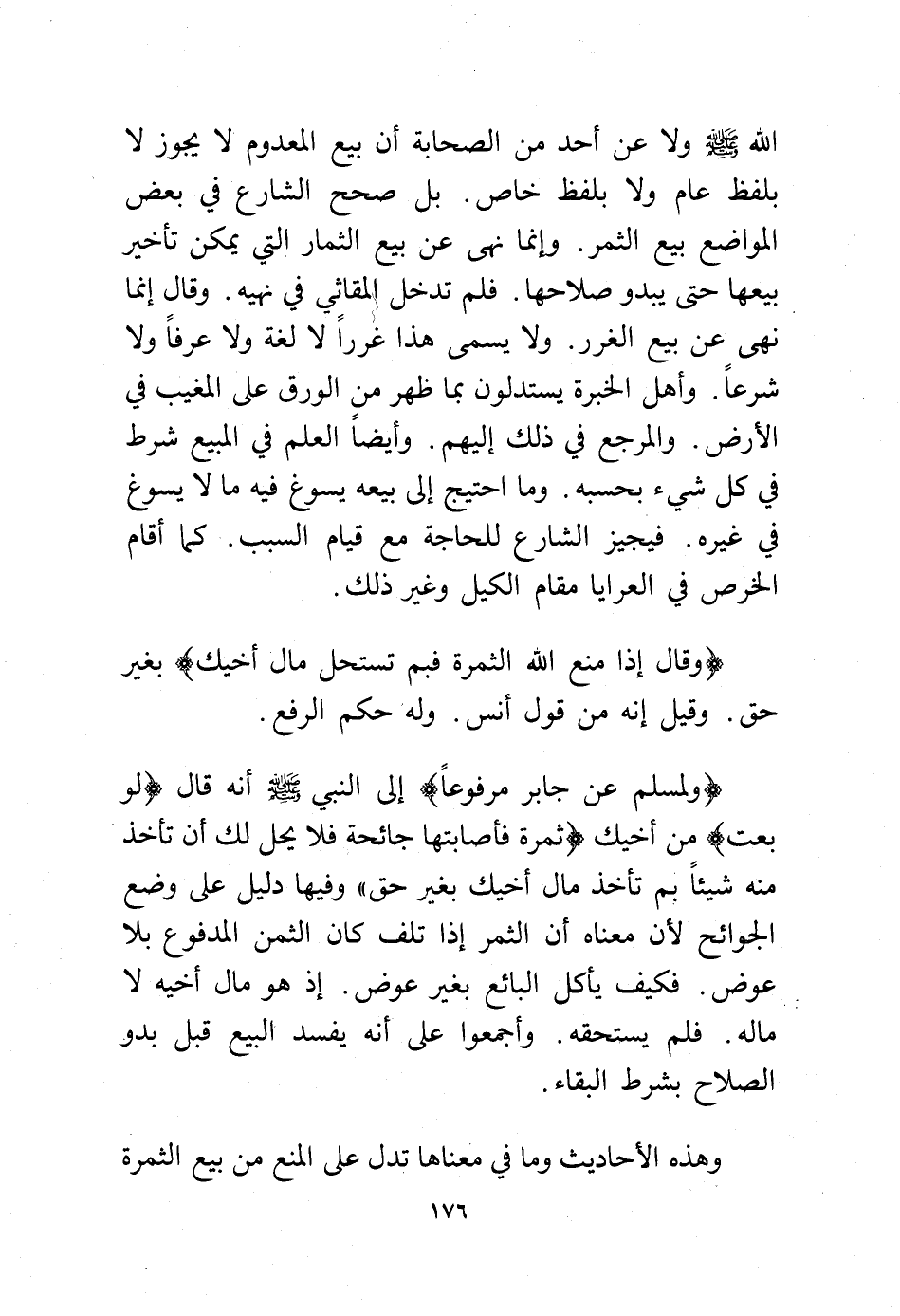 الله - صلى الله عليه وسلم - ولا عن أحد من الصحابة أن بيع المعدوم لا يجوز لا بلفظ عام ولا بلفظ خاص. بل صحح الشارع في بعض المواضع بيع الثمر. وإنما نهى عن بيع الثمار التي يمكن تأخير بيعها حتى يبدو صلاحها. فلم تدخل المقاثي في نهيه. وقال إنما نهى عن بيع الغرر. ولا يسمى هذا غررًا لا لغة ولا عرفًا ولا شرعًا. وأهل الخبرة يستدلون بما ظهر من الورق على المغيب في الأرض. والمرجع في ذلك إليهم. وأيضًا العلم في المبيع شرط في كل شيء بحسبه. وما احتيج إلى بيعه يسوغ فيه ما لا يسوغ في غيره. فيجيز الشارع للحاجة مع قيام السبب. كما أقام الخرص في العرايا مقام الكيل وغير ذلك.