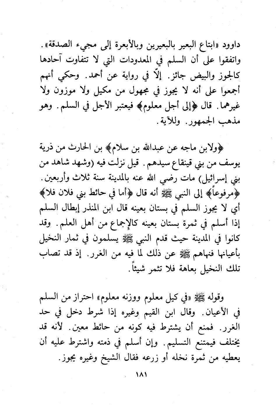 (ولابن ماجه عن عبد الله بن سلام) بن الحارث من ذرية يوسف من بني قينقاع سيدهم. قيل نزلت فيه (وشهد شاهد من بني إسرائيل) مات -رضي الله عنه- بالمدينة سنة ثلاث وأربعين. (مرفوعًا) إلى النبي - صلى الله عليه وسلم - أنه قال (أما في حائط بني فلان فلا) أي لا يجوز السلم في بستان بعينه قال ابن المنذر إبطال السلم إذا أسلم في ثمرة بستان بعينه كالإجماع من أهل العلم. وقد كانوا في المدينة حيث قَدِم النبي - صلى الله عليه وسلم - يسلمون في ثمار النخيل بأعيانهم فنهاهم - صلى الله عليه وسلم - عن ذلك لما فيه من الغرر. إذ قد تصاب تلك النخيل بعاهة فلا تثمر شيئًا.