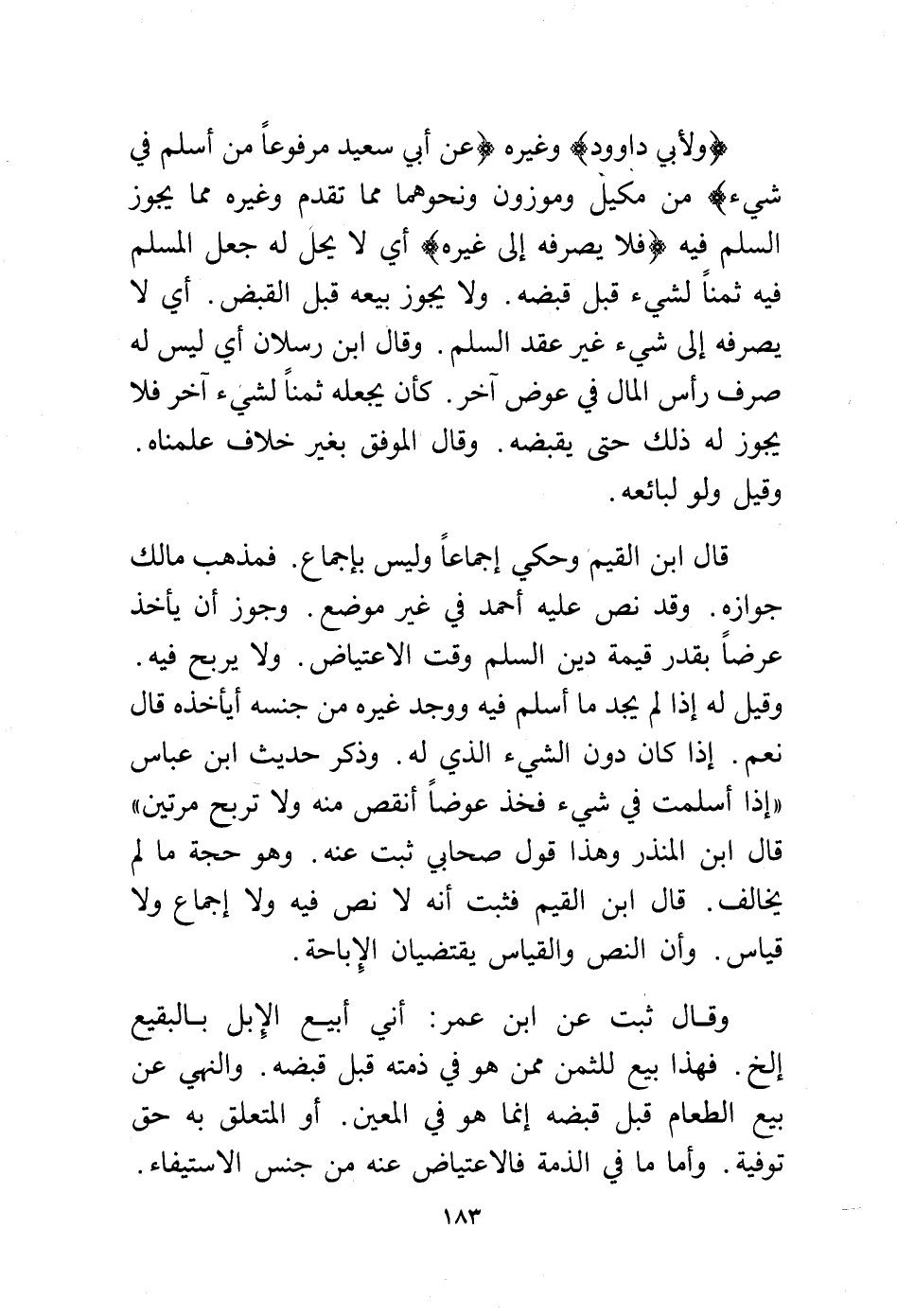 (ولأبي داوود) وغيره (عن أبي سعيد مرفوعًا من أسلم في شيء) من مكيل وموزون ونحوهما مما تقدم وغيره مما يجوز السلم فيه (فلا يصرفه إلى غيره) أي لا يحل له جعل المسلم فيه ثمنًا لشيء قبل قبضه. ولا يجوز بيعه قبل القبض. أي لا يصرفه إلى شيء غير عقد السلم. وقال ابن رسلان أي ليس له صرف رأس المال في عوض آخر. كأن يجعله ثمنًا لشيء آخر فلا يجوز له ذلك حتى يقبضه. وقال الموفق بغير خلاف علمناه. وقيل ولو لبائعه.