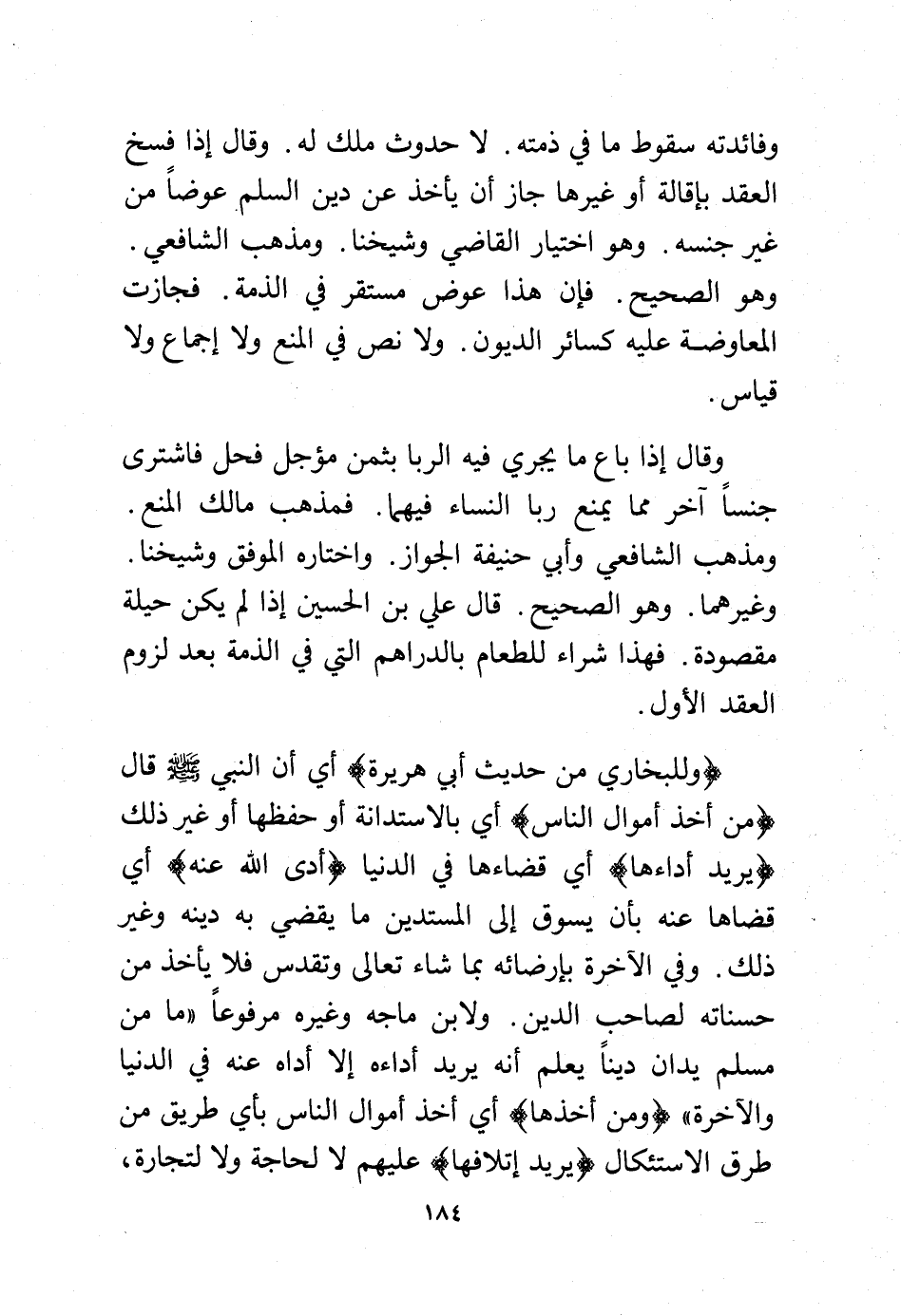 (وللبخاري من حديث أبي هريرة) أي أن النبي - صلى الله عليه وسلم - قال (من أخذ أموال الناس) أي بالاستدانة أو حفظها أو غير ذلك (يريد أداءها) أي قضاءها في الدنيا (أدى الله عنه) أي قضاها عنه بأن يسوق إلى المستدين ما يقضي به دينه وغير ذلك. وفي الآخرة بإرضائه بما شاء تعالى وتقدس فلا يأخذ من حسناته لصاحب الدين. ولابن ماجه وغيره مرفوعًا "ما من مسلم يدان دينًا يعلم أنه يريد أداءه إلا أداه عنه في الدنيا والآخرة" (ومن أخذها) أي أخذ أموال الناس بأي طريق من طرق الاستئكال (يريد إتلافها) عليهم لا لحاجة ولا لتجارة،