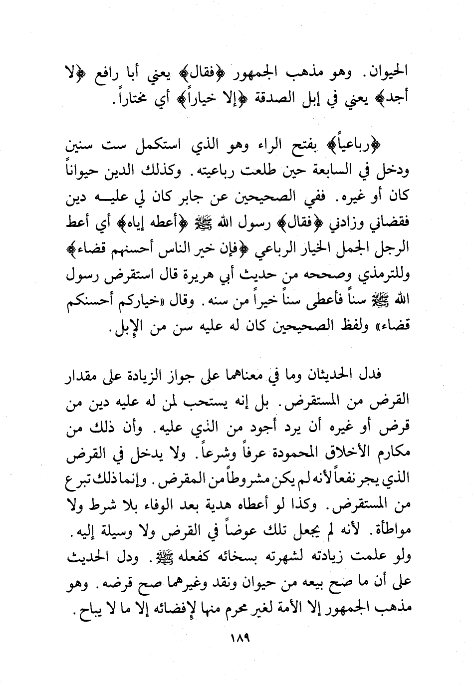فدل الحديثان وما في معناهما على جواز الزيادة على مقدار القرض من المستقرض. بل إنه يستحب لمن له عليه دين من قرض أو غيره أن يرد أجود من الذي عليه. وأن ذلك من مكارم الأخلاق المحمودة عرفًا وشرعًا. ولا يدخل في القرض الذي يجر نفعًا لأنه لم يكن مشروطًا من المقرض. وإنما ذلك تبرع من المستقرض. وكذا لو أعطاه هدية بعد الوفاء بلا شرط ولا مواطأة. لأنه لم يجعل تلك عوضًا في القرض ولا وسيلة إليه. ولو علمت زيادته لشهرته بسخائه كفعله –صلى الله عليه وسلم. ودل الحديث على أن ما صح بيعه من حيوان ونقد وغيرهما صح قرضه. وهو مذهب الجمهور إلا الأمة لغير محرم منها لإفضائه إلا ما لا يباح.